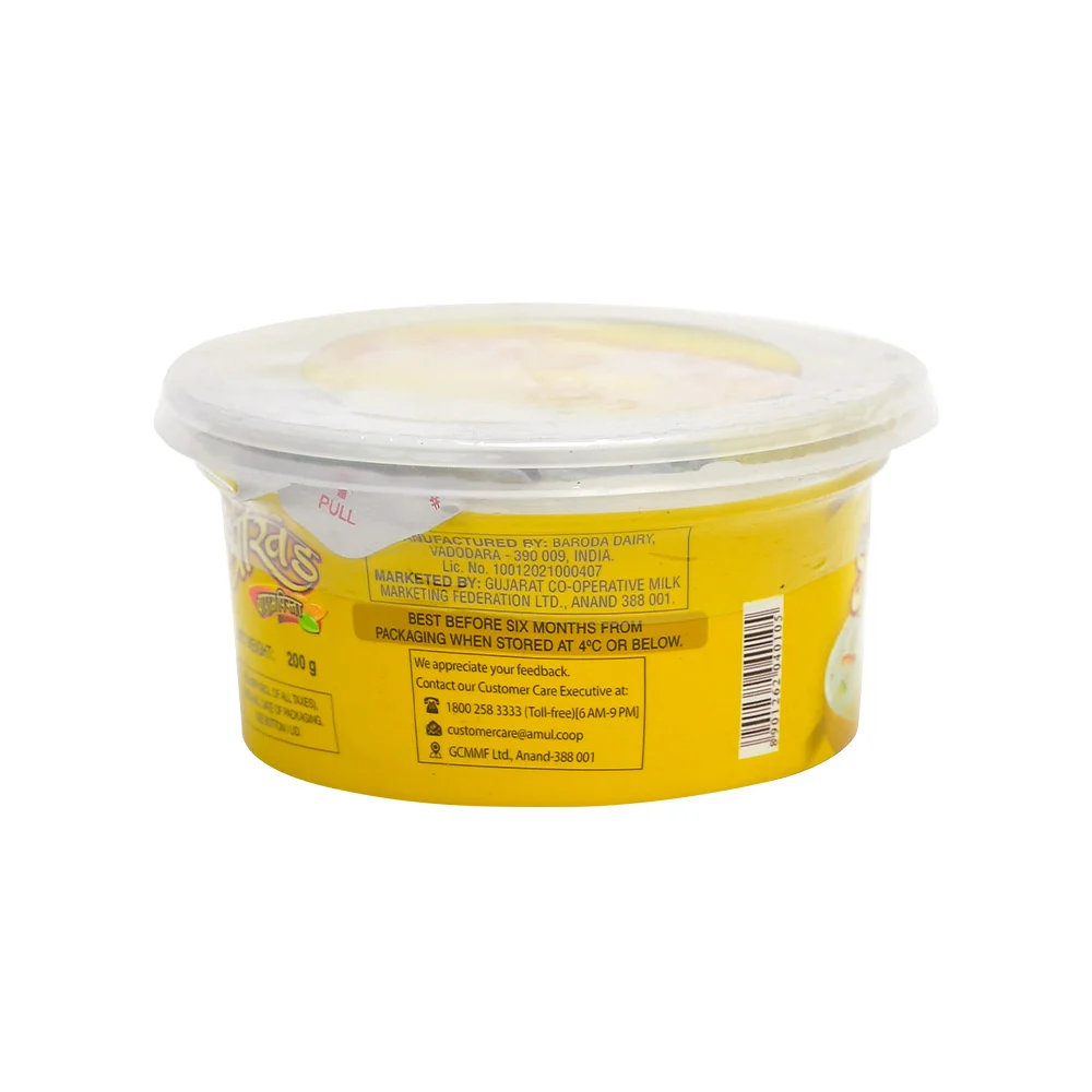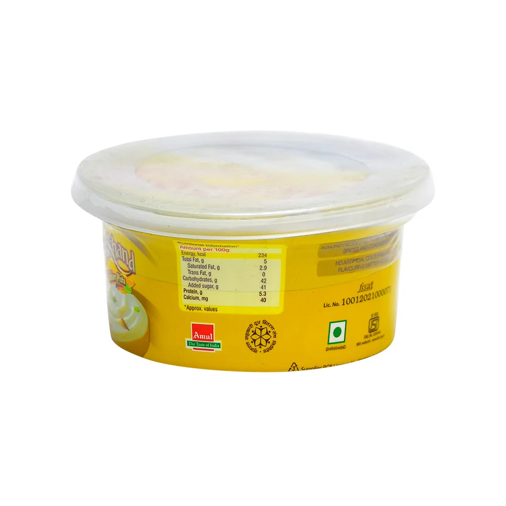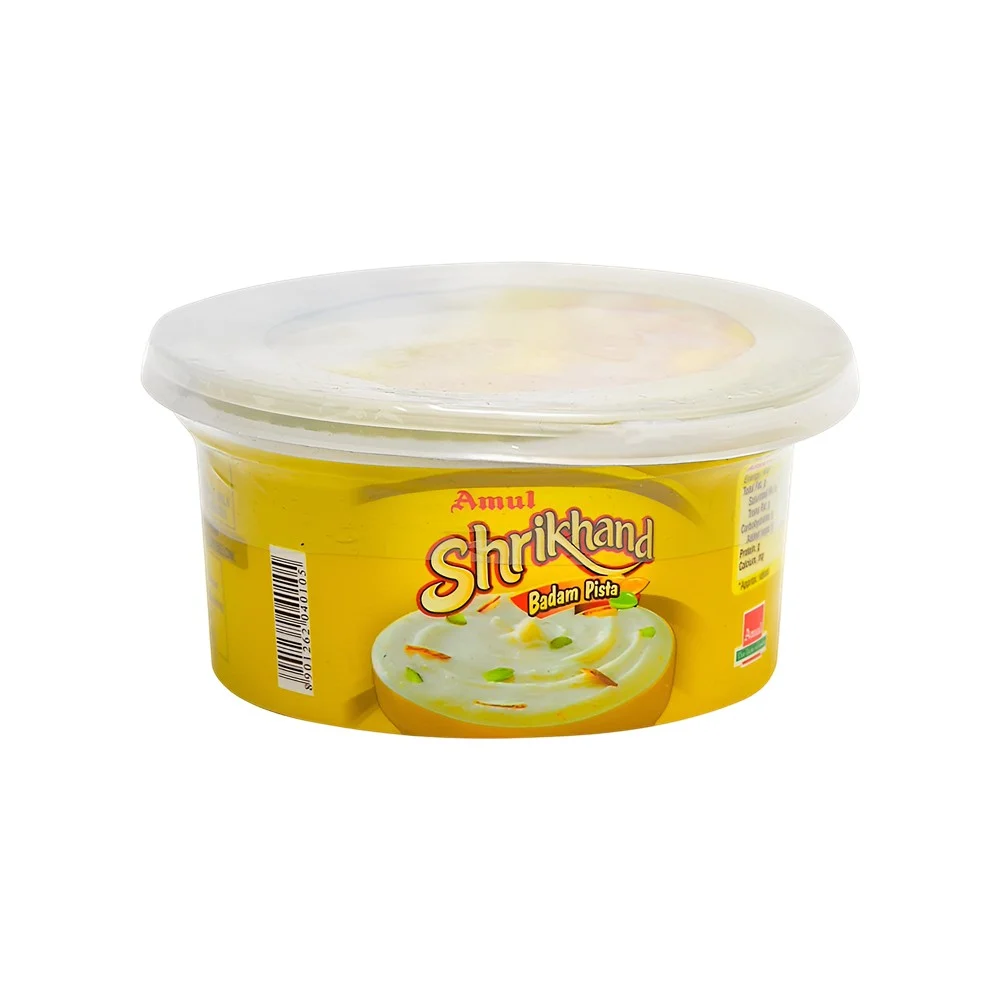 Amul Badam Pista Shrikhand (Cup) is prepared from fresh curd and cream which gives it a smooth, tastier, richer and uniform texture and taste. It has a delicious flavour with a sweet taste of Badam and Pista as well.