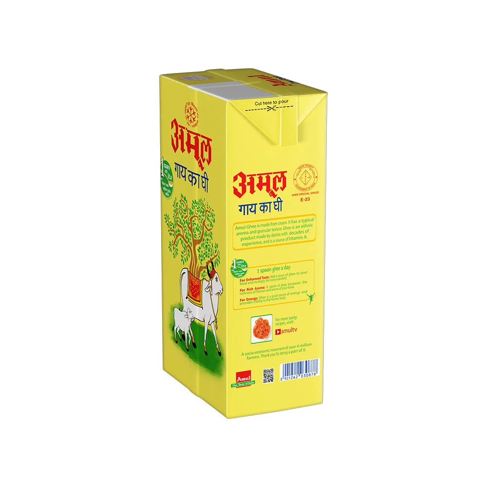 Processed from fresh cream of pure cow milk, Amul Ghee is a rich source of vitamin A, vitamin D, vitamin E, vitamin K. It is granular and rich in aroma and taste. Consumed with chapattis or used for tempering pulses, vegetables and rice, ghee brings a delectable flavour to food.