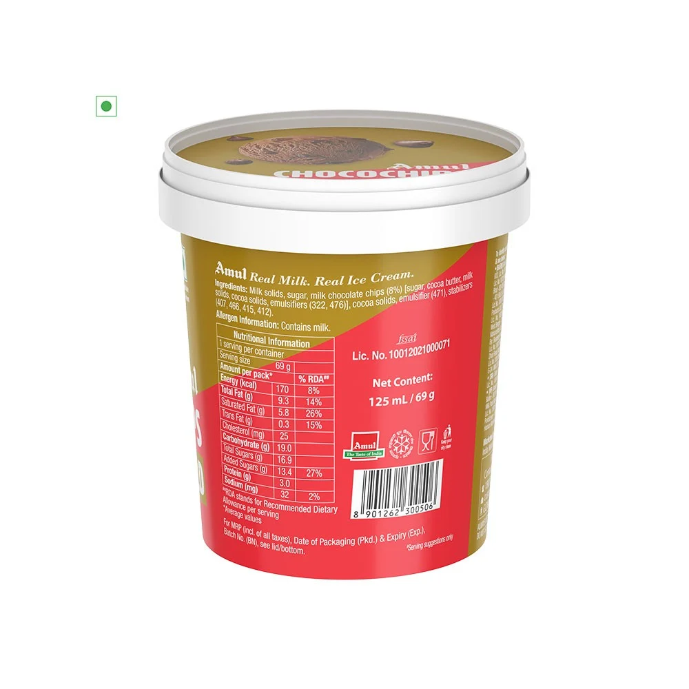 Milk solids, sugar, milk chocolate chips (8%) [sugar, cocoa butter, milk solids, cocoa solids, emulsifiers (322, 476)], cocoa solids, emulsifier (471), stabilizers (407, 466, 415, 412).