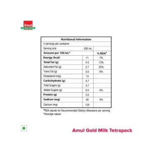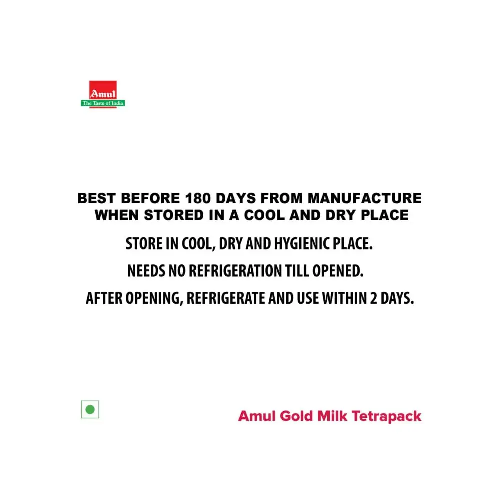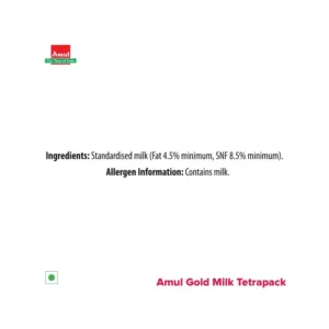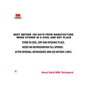 Pasteurised in state-of-the-art processing plants,Amul Gold Milk (Tetra Pak) is very rich and creamy in texture. It is ideal for preparing tea, coffee, sweets, khoya, curd, buttermilk, ghee etc.