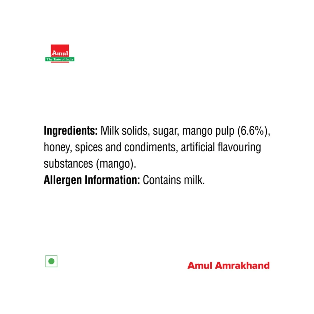 Milk Solids, Sugar, Mango Pulp (6.6%), Honey, Spices And Condiments, Artificial Flavouring Substances(Mango).