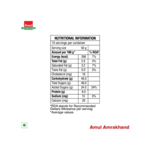 Average Nutritional Value As Per 50g – Energy 266kcal, Total Fat 5.5g, Saturated Fat 3.2g, Trans Fat 0.0g, Cholesterol 16mg, Carbohydrate 46.0g, Total Sugars 46.0g, Added Sugars 34.0g, Protein 8.0g, Sodium 13 0mg, Calcium 20mg.