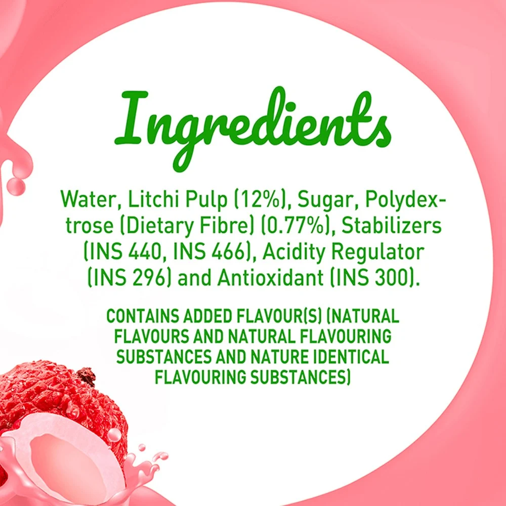 Water, Litchi Pulp (20%), Sugar, Acidity Regulator (INS 296), Stabiliser (INS 440), Antioxidant (INS 300), Contains Added Flavour (s) (Nature Identical Flavouring Substances)