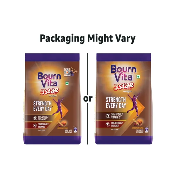 Bournvita 5 Star Magic Drink Mix with caramel flavour is a scientifically designed formula, crafted by nutritionists with a bundle of nutrients (calcium, vitamin D, iron, zinc, etc.) that are known to provide high energy and support physical, mental, and immune strength. Bournvita chocolate drink to be consumed as a part of a daily balanced diet and healthy lifestyle.