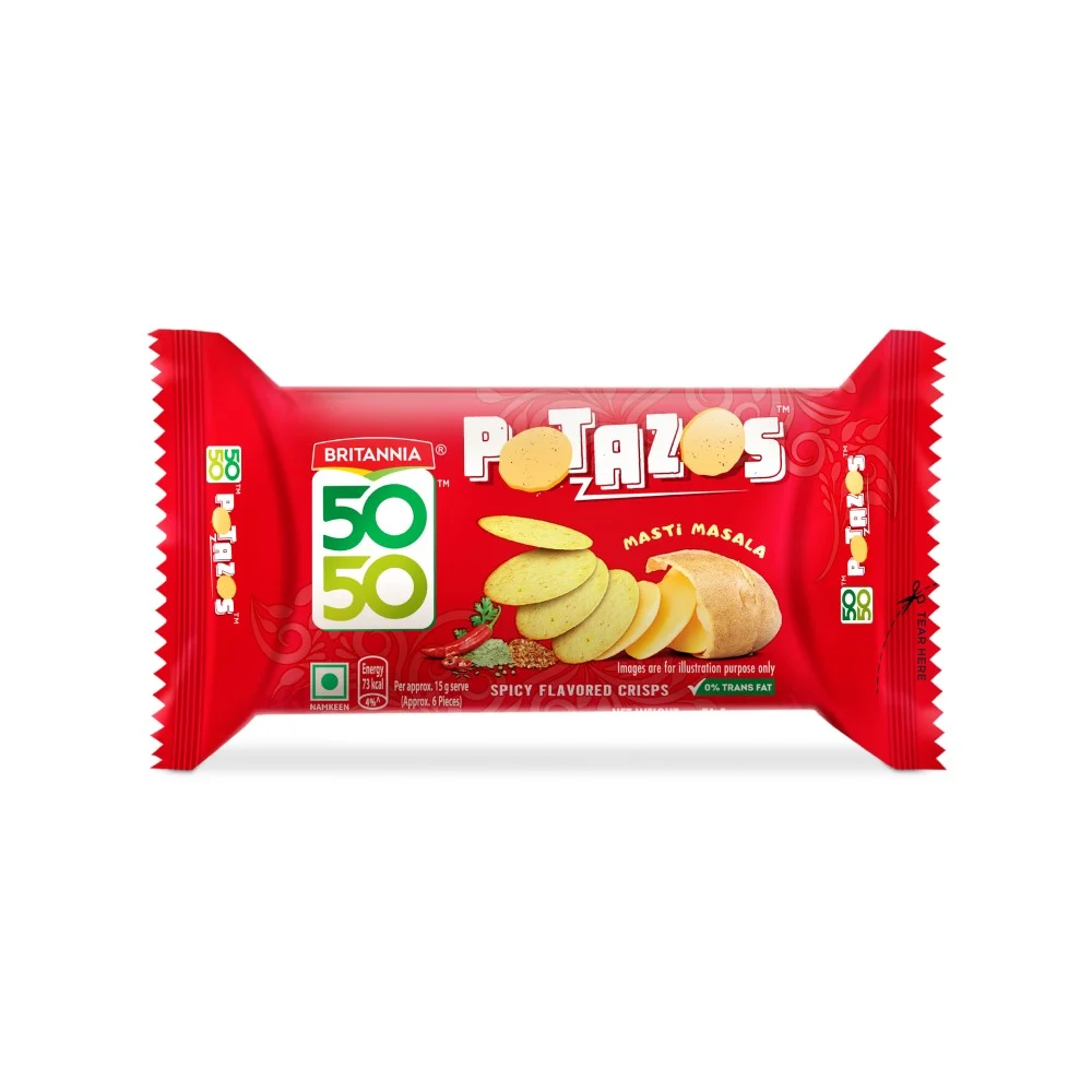 Britannia 50 50 Potazos offers a delightful fusion of two beloved snacks: chips and biscuits. With a masaledar chatpata flavor reminiscent of chips and a baked,crunchy texture,this product is irresistibly tasty. It features an thin and crispy profile that everyone finds addictive. The blend of flavors in 50 50 Potazos creates a delightful snacking experience.