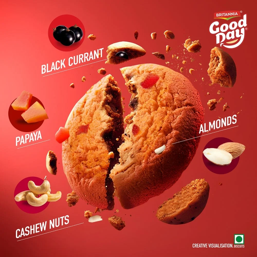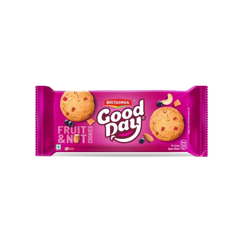 Britannia Good Day Fruit & Nut Cookies :- Indulge in the delightful goodness of Britannia Good Day Fruit and Nut Cookies. Bursting with the perfect blend of fruity sweetness and nutty crunch, these cookies are a true delight for your taste buds. Each bite offers a symphony of flavours and textures, with juicy raisins, succulent pieces of fruit, and crunchy nuts enveloped in a buttery, crumbly cookie base. Whether enjoyed as a mid-day snack or paired with your favourite beverage, Britannia Good Day Fruit and Nut Cookies are sure to elevate your snacking experience. Treat yourself to a moment of indulgence with these irresistible cookies, where every bite is a journey of flavour and satisfaction.