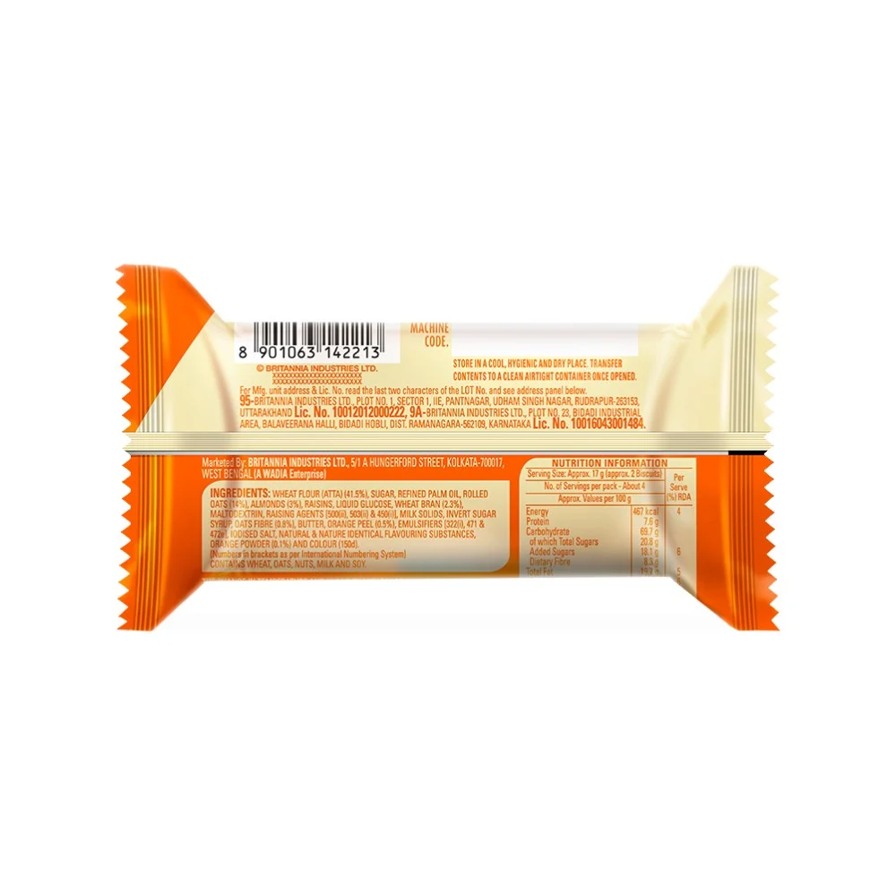 Prepared using Refined Wheat Flour, Sugar, Edible Vegetable Oil (Palm), Rolled Oats, Almond, Raisins, Wheat Bran, Liquid Glucose, Raising Agents, Maltodextrin, Oat Fibre, Milk Solids, Invert Syrup, Orange Peel, Emulsifiers, Iodised Salt and Orange Powder