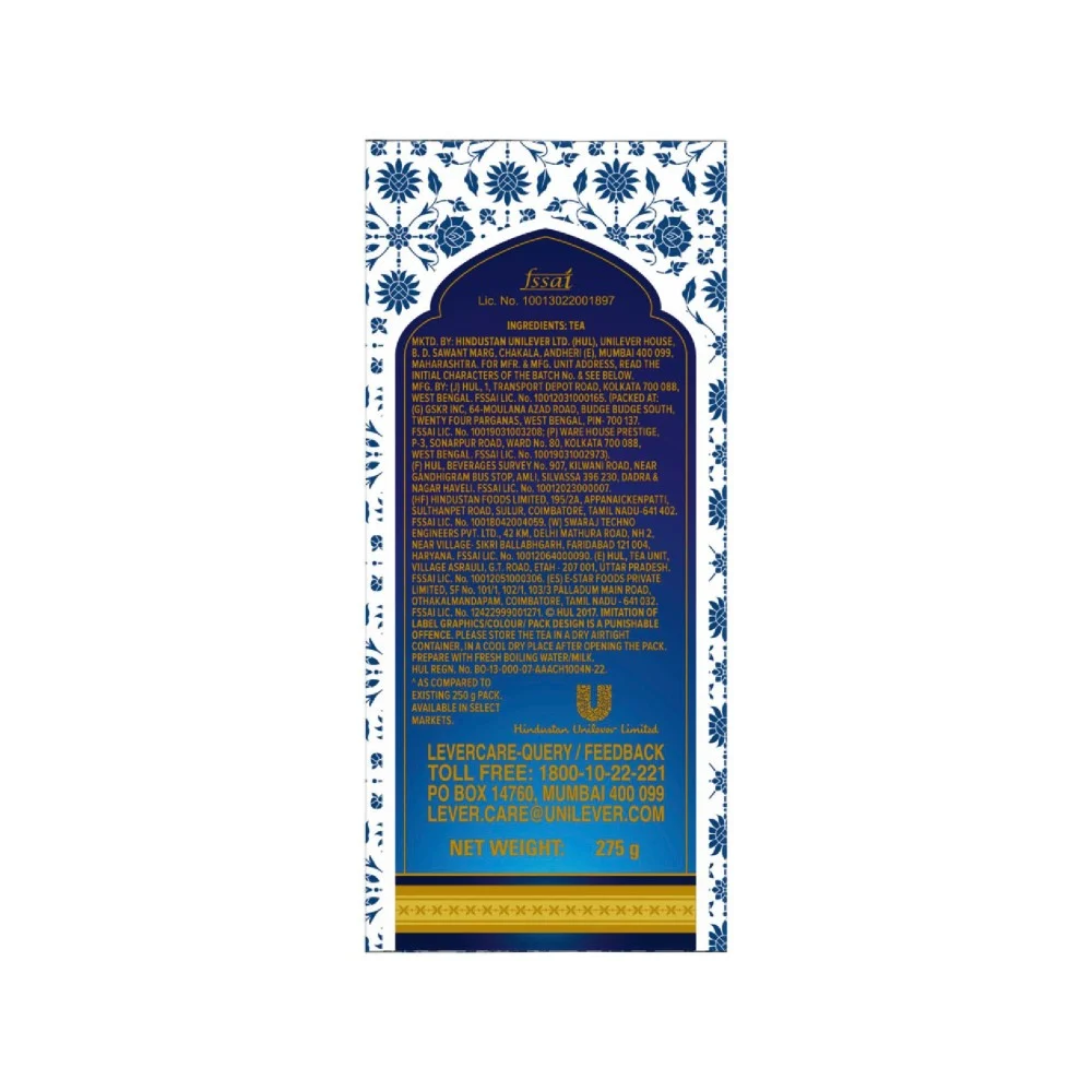 Brookbond Taj Mahal Tea is a blend of expertly chosen tea leaves that bring a strong aroma and great taste together. Strong and refreshing, this tea is made from selected tea leaves that are blended to perfection to impart a natural goodness. This tea blend is tasted, graded and perfectly blended at the Brooke Bond Tea Excellence Centre to keep the authentic taste intact. The pack contains a unique flavour lock system to keep the aroma intact. Imparts a pleasing aura that cheers you up from within. Perfect balance of strength and flavour.