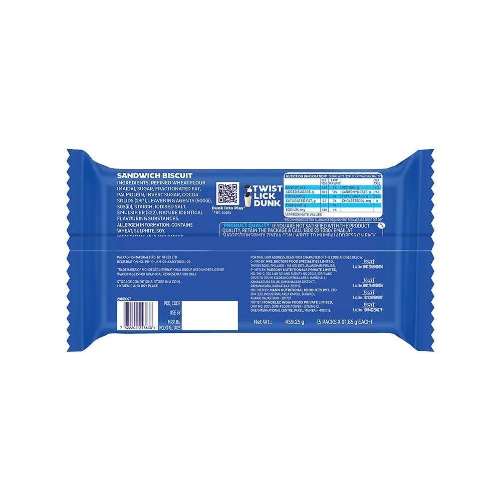 OREO: milk’s best friend for over 100 years! Cadbury OREO Vanilla crème sandwich biscuit consists of two chocolatey biscuits with a rich vanilla crème filling between them. Cadbury OREO crème biscuits are made with cocoa,which defines their unique chocolatey flavour. OREO biscuits are perfect for snacking or enjoying as a treat at any time of the day. Twist,lick and dunk!