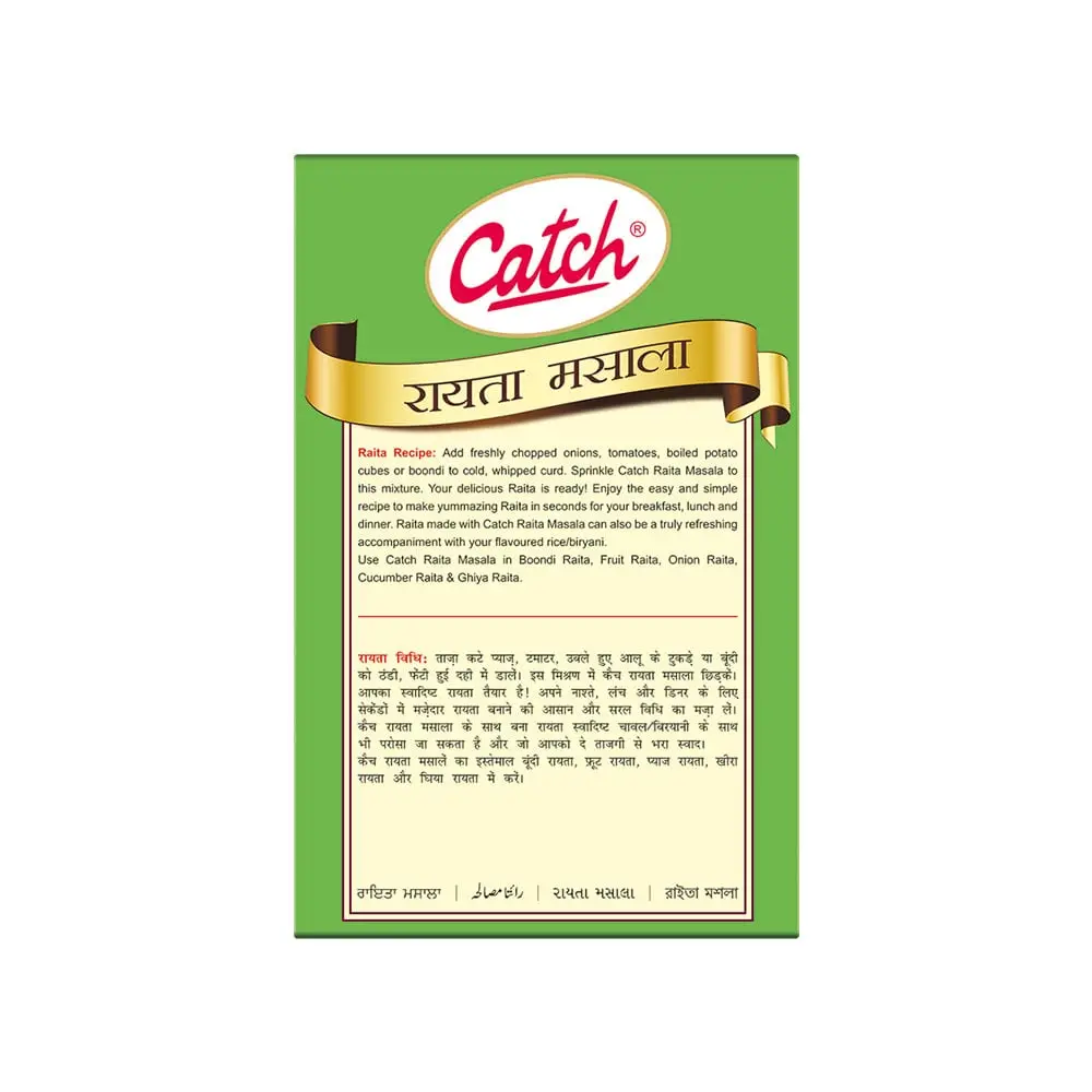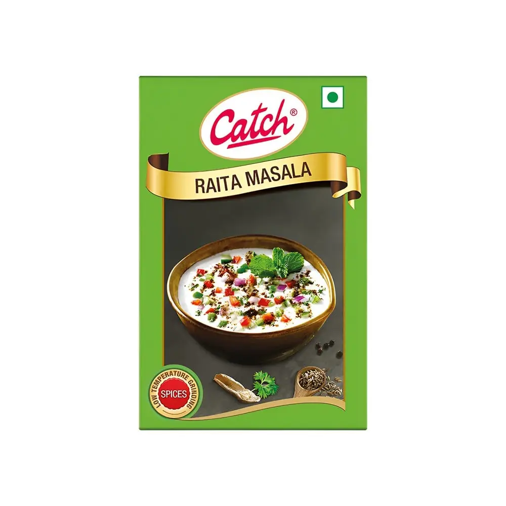 Catch Raita Masala gives your simple curd and vegetables a delicious savoury touch. All-in-one combination of all the Indian masala used as a condiment. This made with advanced LTG technology which retains the flavour and aroma of spices in their original state.