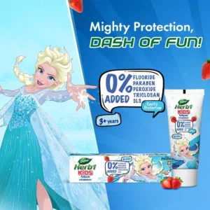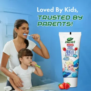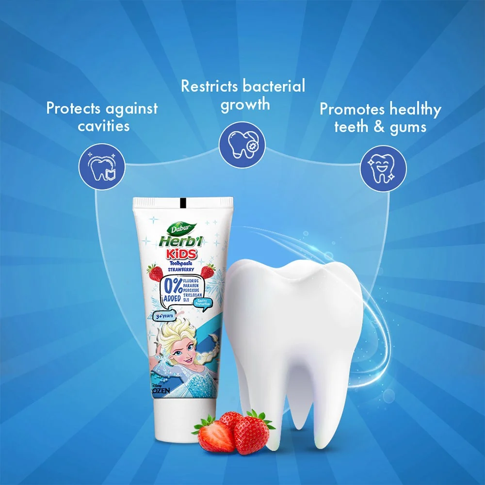 Encouraging good oral care habits in kids is essential. Dabur Herb’l Kids toothpaste comes with a juicy flavor of Watermelon without any added Parabens, Flouride or SLS, ensuring a pleasant brushing experience. Specially designed for kids with 50% less abrasive formula, its gentle yet effective. Enriched with Babool, Liqourice, and Miswak for complete oral hygiene, it fights oral bacteria, maintains gum health, and prevents cavities. Start your child’s oral care journey with Dabur Herb’l Kids for stronger and healthier teeth.