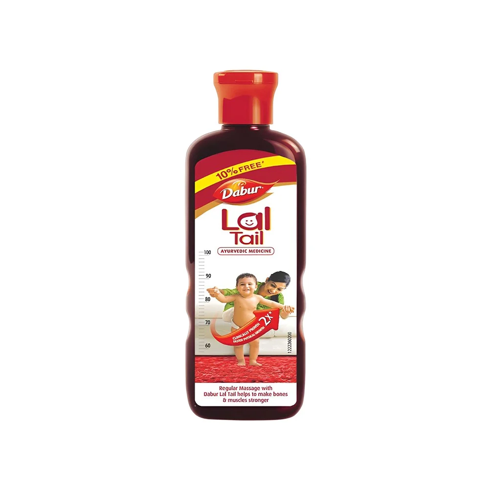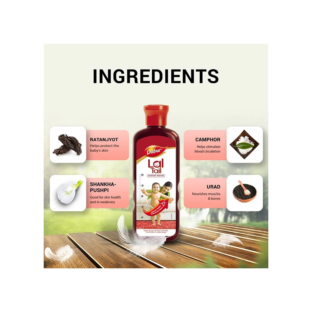 Each 100ml of Dabur Lal Tail is prepared from :Shankhaphuspi,masha , ratnajot,Tanscher ,Sarala Taila