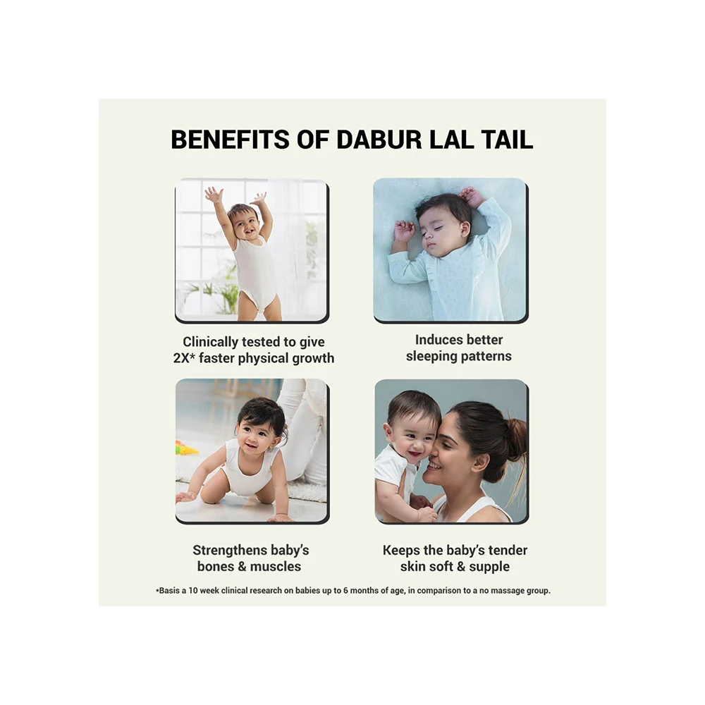 Made with time tested ingredients that have many proven benefits for babies Dabur Lal Tail contains Ratyanjot which helps protect the baby’s skin, camphor which helps with blood circulation, Shankhpushpi which is good for skin health and in weakness, and Urad which nourishes muscles and bones Regular massage with Dabur Lal Tail also helps relieve colic and other digestive problems, improves sleep patterns of your little one, and stimulates blood circulation