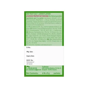 Each 5gms: Svarjiksara (Sudh) 2.20gms, Nimbukamlam (Shushkam) 2.07 gms, permitted sweetener, Sodium Saccharin 22mg and permitted colors, permitted flavours added q.s