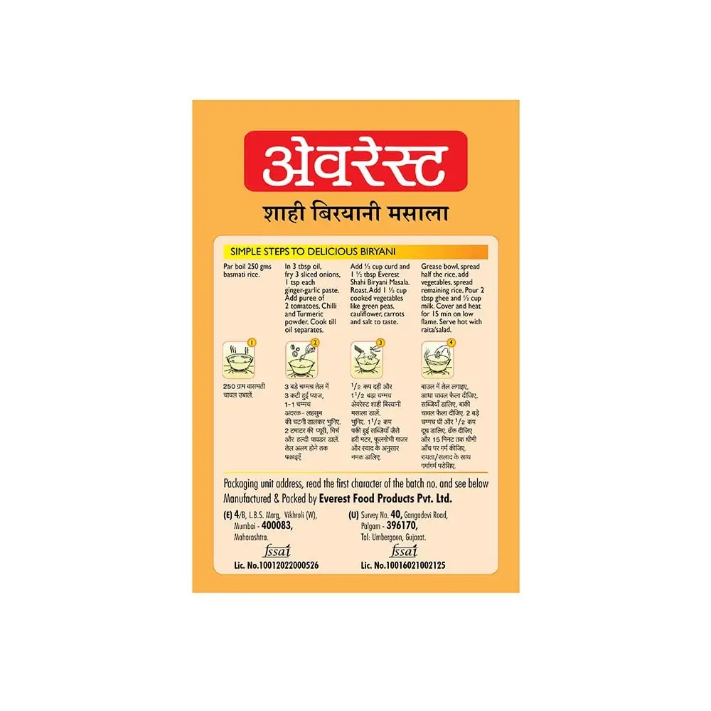 Enjoy a wholesome family dinner with the delicous goodness of royal spices from a tried-and-tested masala blend with Everest Shahi Biriyani Masala, The spice blend gives a flavourful aroma and delicious taste to your Dum Biryani, Made from a blend of spices like cloves, cinnamon, bay leaf, mace, nutmeg, cardamom, black stone flower, caraway seeds, coriander, cumin, and fennel seeds, This premium-quality masala will make your biryani the favourite dish at any family gathering, It is free from chemical preservatives.