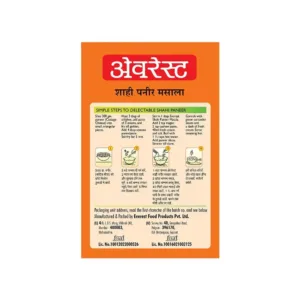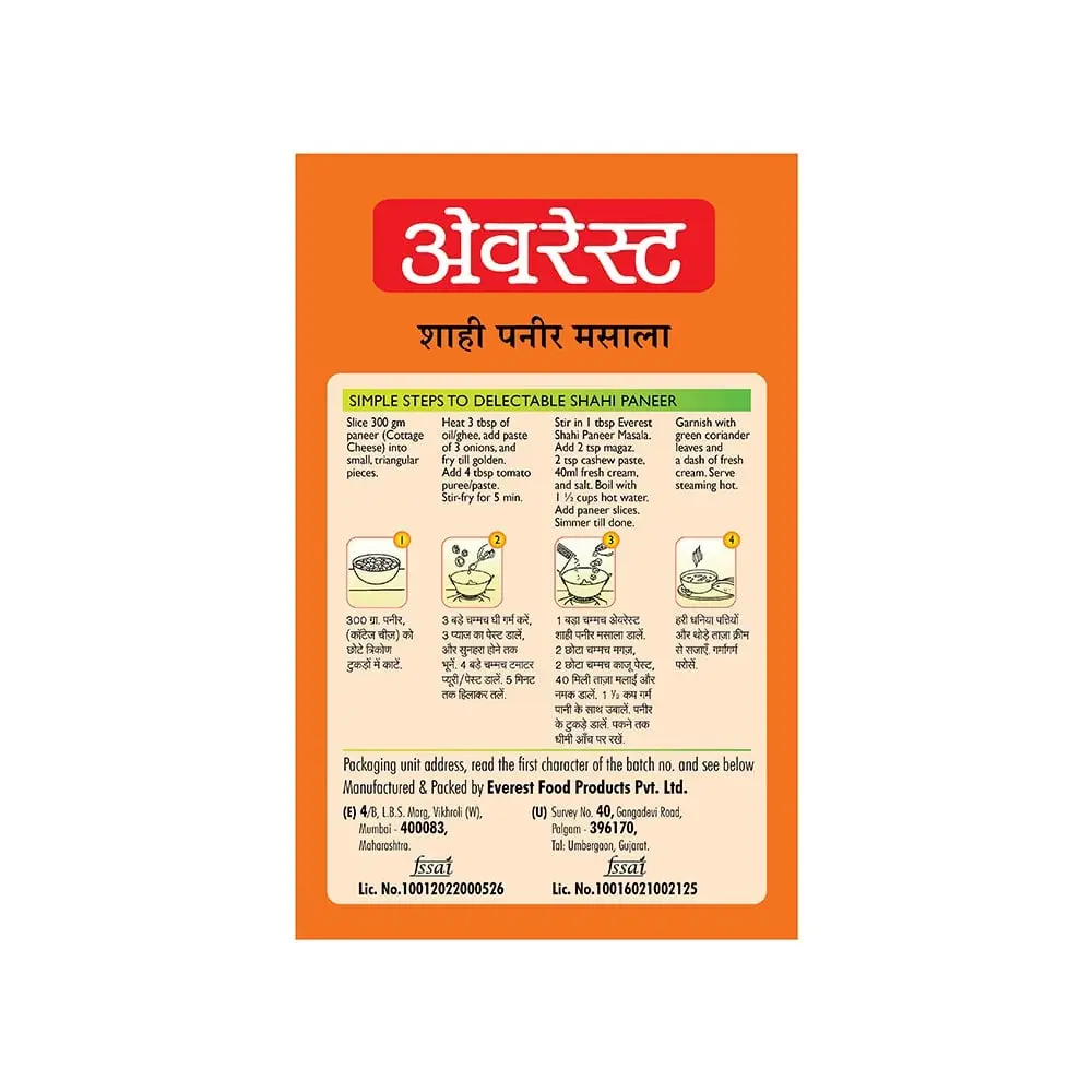 Everest Shahi Paneer Masala is the perfect addition to make your Shahi paneer curry taste mouth-watering, The smooth blend of spices imparts a rich flavour and delicious aroma to your recipe, Also adds to the texture of the gravy, giving it a smooth and thick consistency, It is made of a blend of several exotic spices like coriander, cumin, cassia leaf, chilli, black pepper, turmeric, cassia, clove, black cardamom, dry mango, Bengal gram, dry ginger, etc.