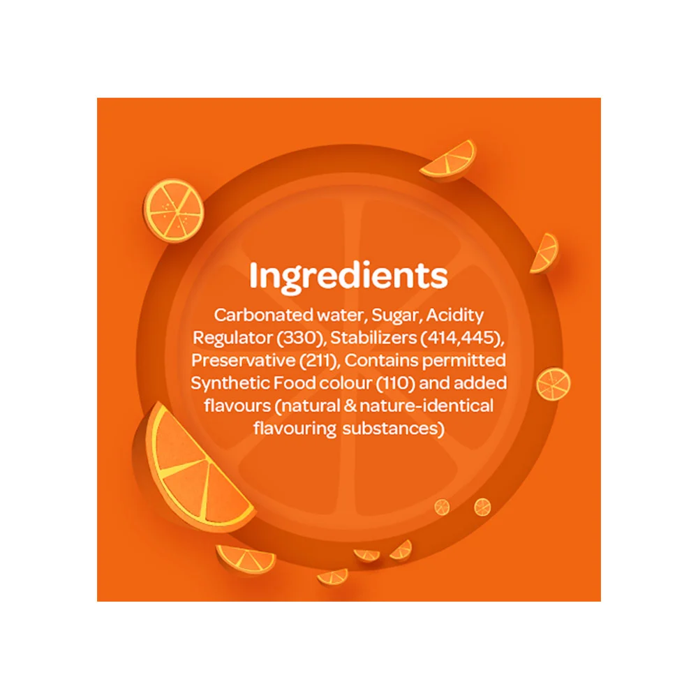 Carbonated Water, Sugar, Acidity Regulator (330), Stabilizers (414, 445), Preservative (211), Colour (110), Permitted Class II Preservative, Synthetic Food Colour, Added Flavours (Natural and Nature-Identical Flavouring Substances), Contains No Fruit