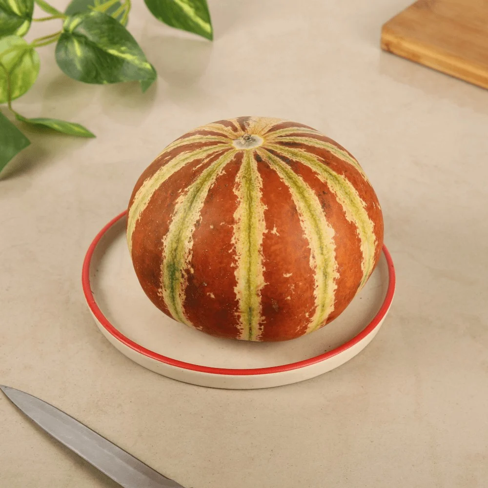Kajri muskmelon, known for its distinct striped green and yellow outer skin and sweet, aromatic flesh. Sweet and fragrant, similar to cantaloupe but with a hint of earthiness and Highly fragrant when fully ripe.