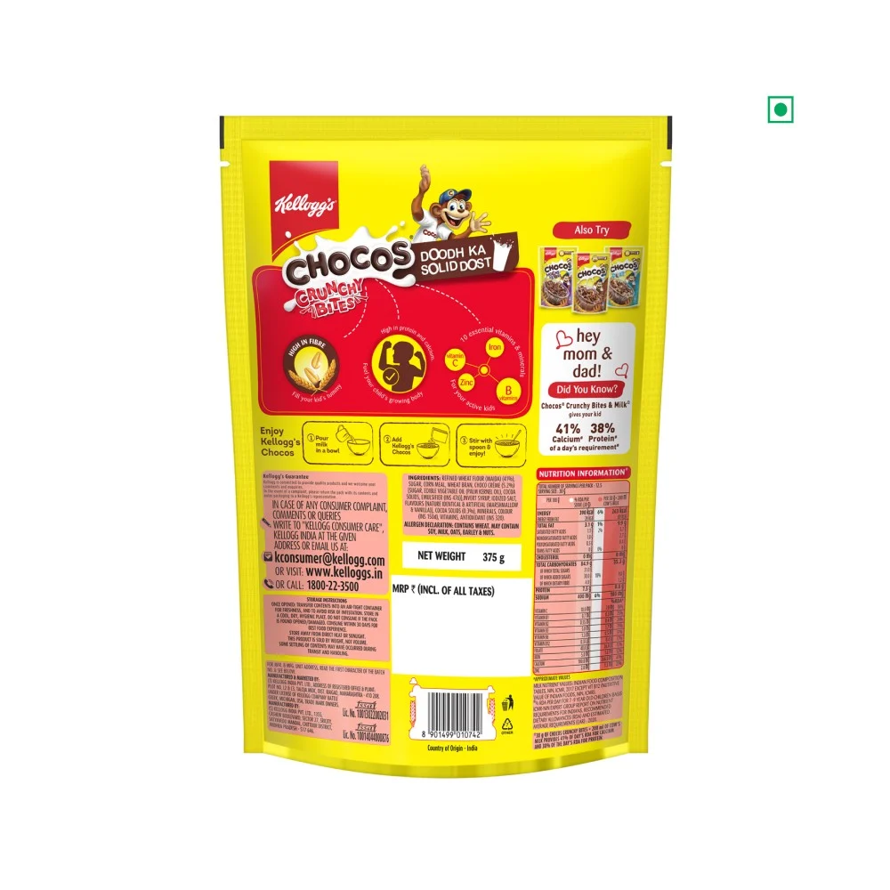 Kellogg’s Chocos Crunchy Bites is a rich source of fibre and makes for a perfect cereal. It contains calcium and the goodness of wheat along with delicious cocoa flavour. Be it hot milk or cold milk, nuts or chocolate syrup, this cereal teams up perfectly with anything to make a wholesome treat.