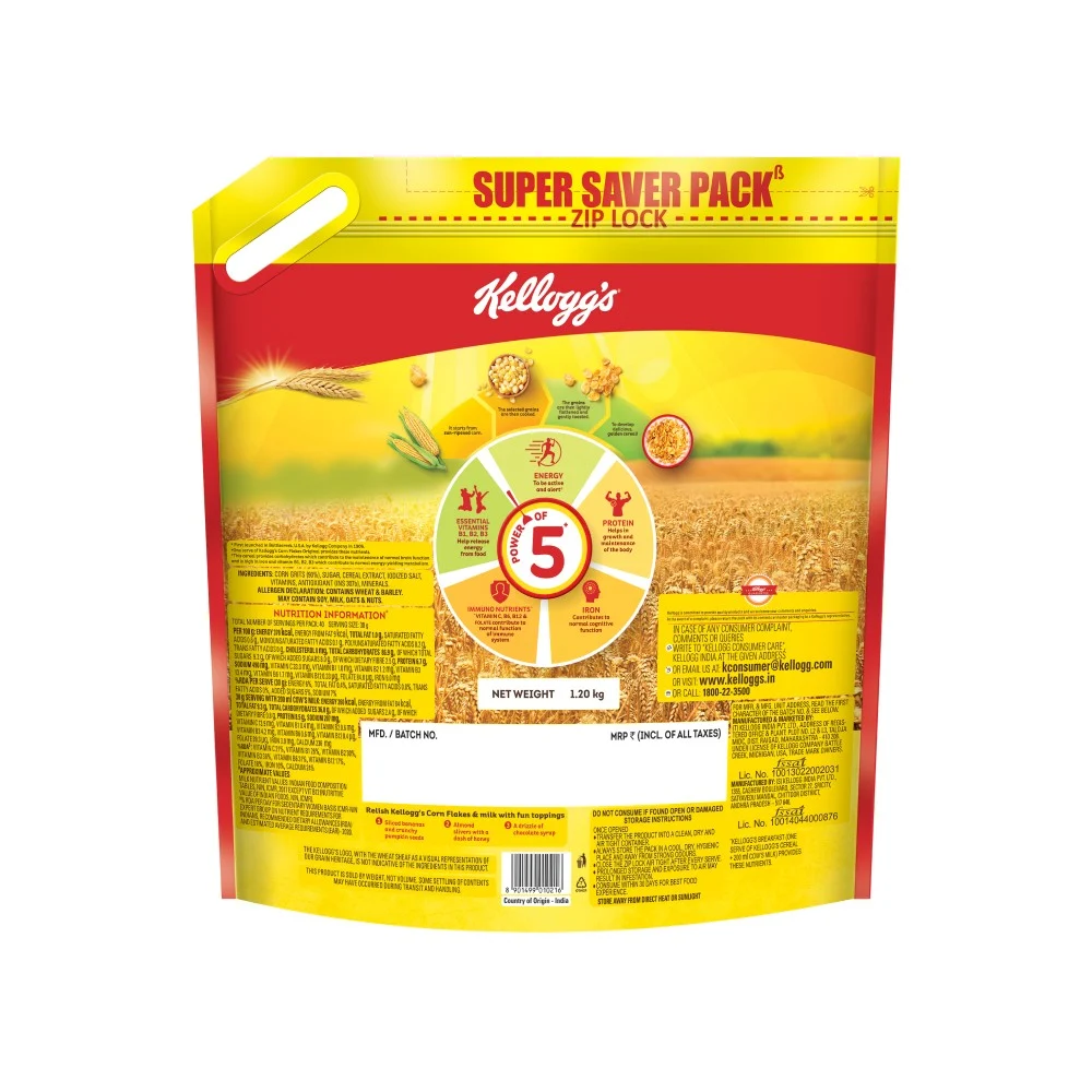 Kellogg’s Corn Flakes is a nourishing and tasty ready-to-eat breakfast cereal which is High in Iron, Vitamin C and key essential B group Vitamins such as B1, B2, B3, B6, B12 and Folate. Kellogg’s Corn Flakes Original is naturally cholesterol free. It contains only 1% Fat. You can count on Kellogg’s for a great tasting and convenient breakfast that is nourishing. These corn flakes are made from sun ripened corn. The selected grains are cooked, flattened and are gently toasted to develop into your delicious golden crispy cereal. Kellogg’s Corn Flakes is a quick and convenient breakfast option that is ready in minutes. Serve it with milk or curd/yoghurt and top it with fresh fruits such as bananas, strawberry or mangoes, dry fruits, honey and enjoy a nourishing breakfast. Break the monotony of breakfast and use Kellogg’s Corn Flakes as a nourishing/tasty ingredient in a variety of recipes. Use it to prepare various tasty delights loved by kids and adults alike.
