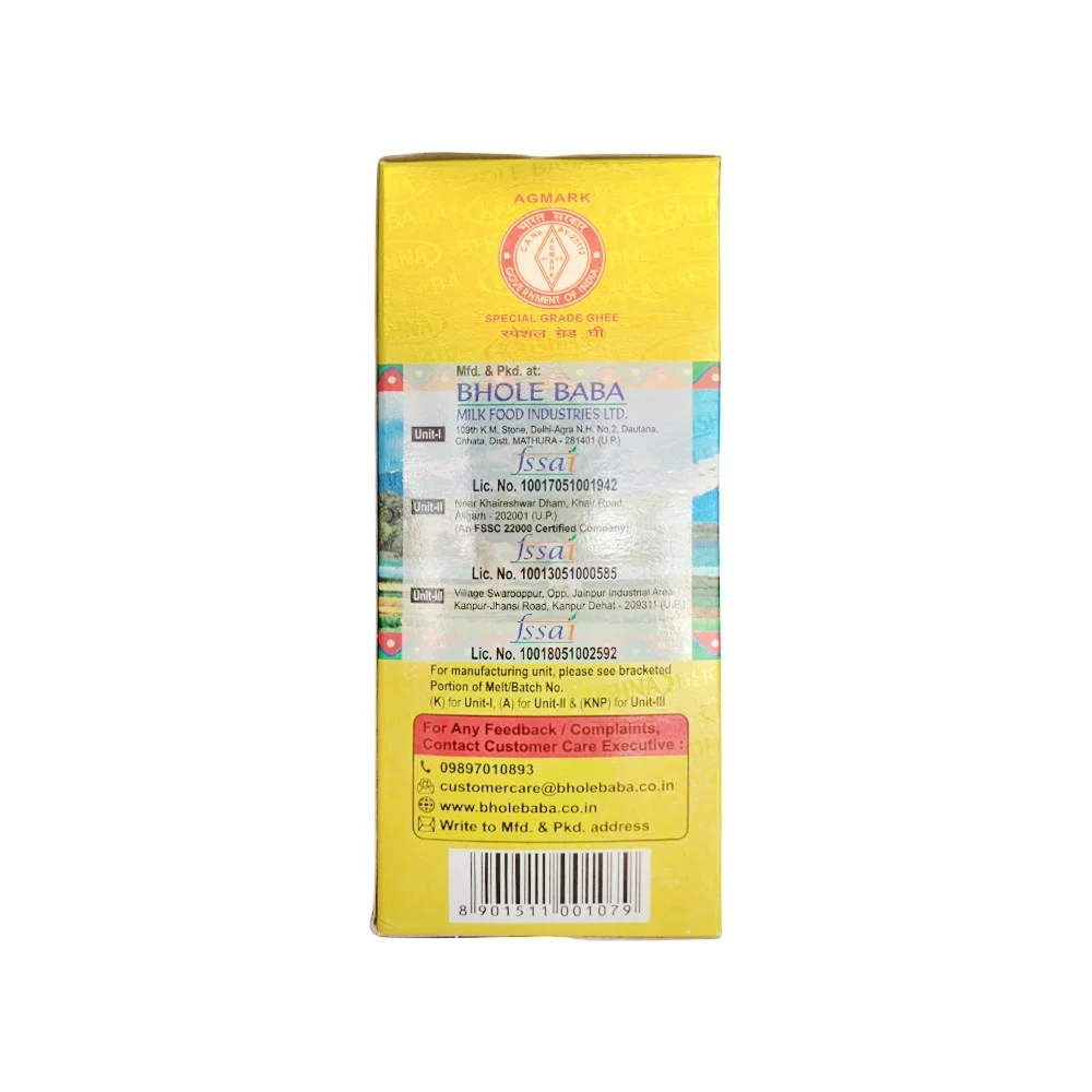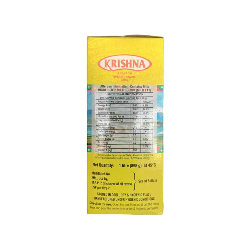 Bring the authentic taste of ghee to your dishes with Krishna Pure Desi Ghee. Prepared from pure cow milk, this ghee has a fragrant aroma and imparts a flavourful taste to your dishes. Smooth texture that adds to the overall taste. The rich aroma imparts a mouth-watering fragrance to your food. The pure formulation is a great source of nutrients to keep you fit. This versatile ghee can be used to cook all Indian recipes.