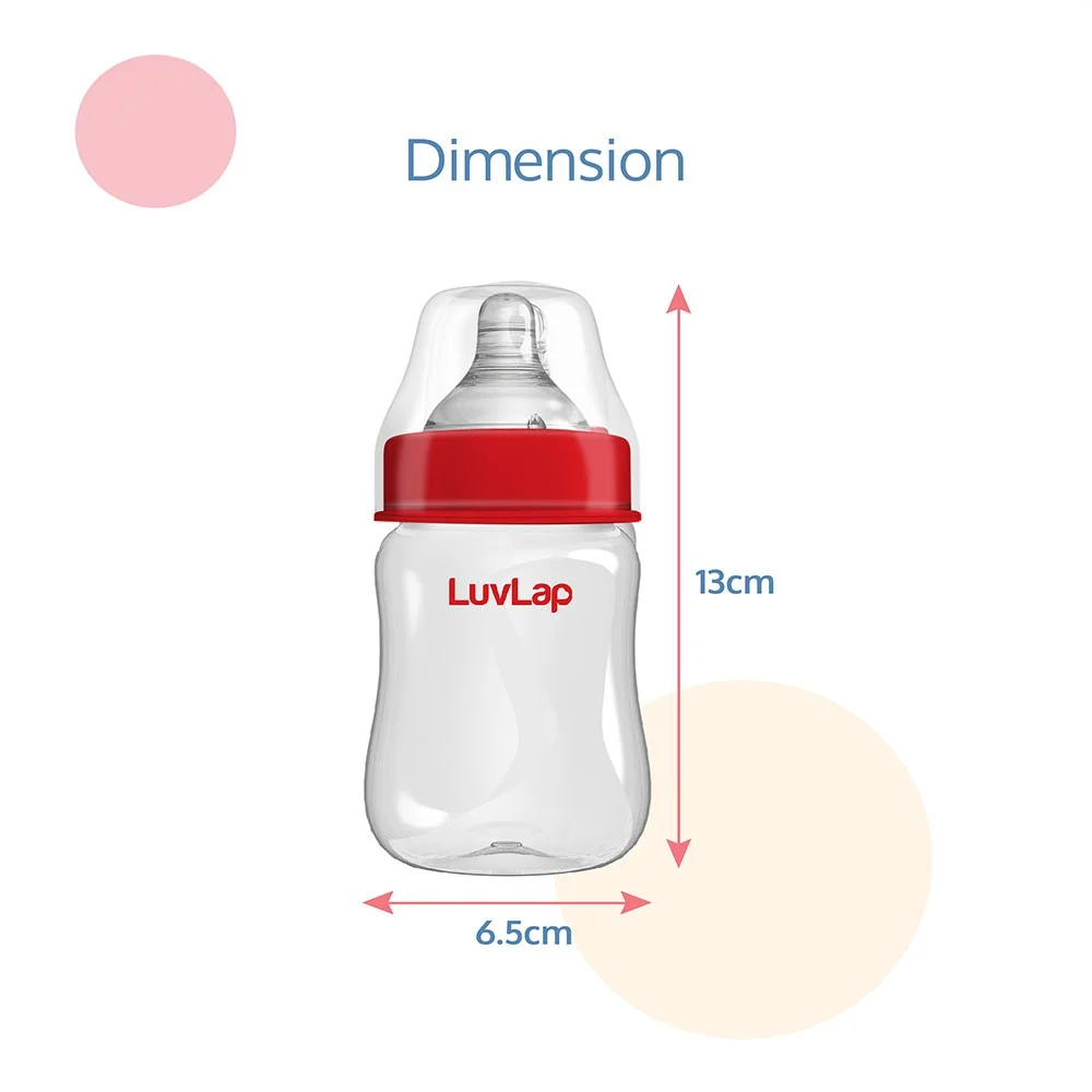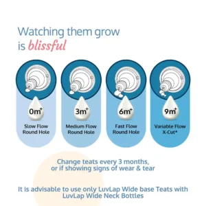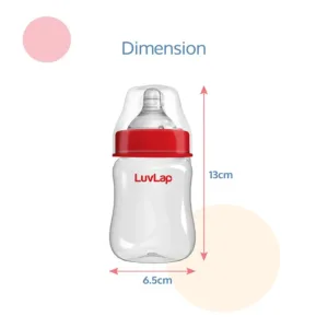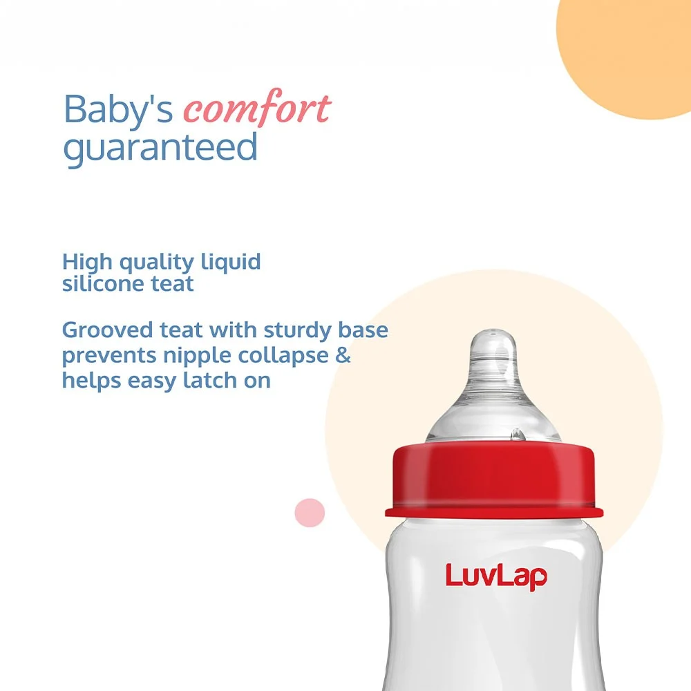 LuvLap Natura Flow Feeding Bottles are ergonomically designed to be easily held while feeding the baby. All LuvLap bottles are 100% BPA free and fully sterilizable. The teats are 100% Liquid Silicone and have an anti-colic valve that vents air into the bottle, preventing any air from entering the baby’s tummy. The teat has grooves at the tip, which encourage peristaltic suckling, while the wide base helps the baby get a natural latch, similar to that on the mother’s breast. This helps easy transition between breastfeeding & bottle feeding. The grooved teats and superior silicone quality ensure no nipple collapse, helping in an uninterrupted feed.