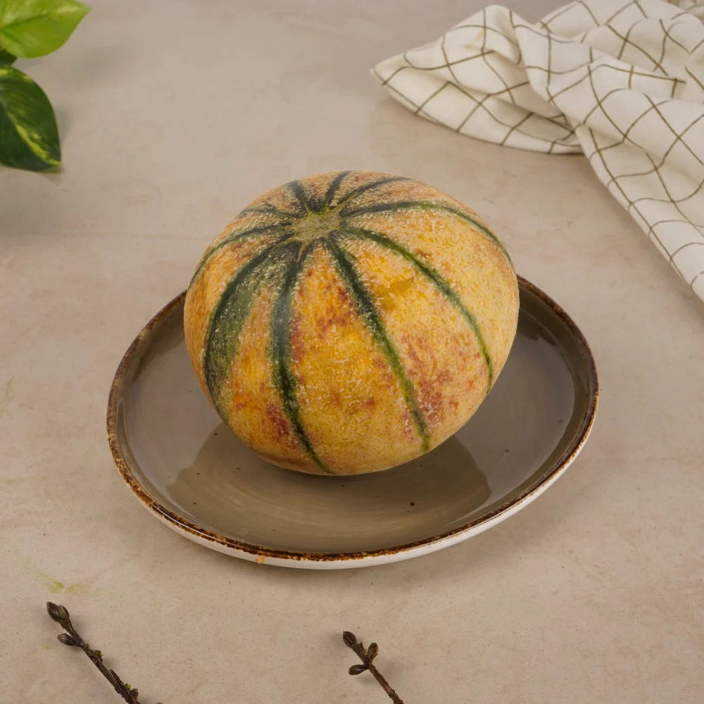 Striped muskmelon, is known for its green-striped rind and sweet, juicy flesh. This melon variety has a sweet and refreshing flavor, making it a delightful addition to fruit salads or enjoyed on its own for a hydrating snack.
