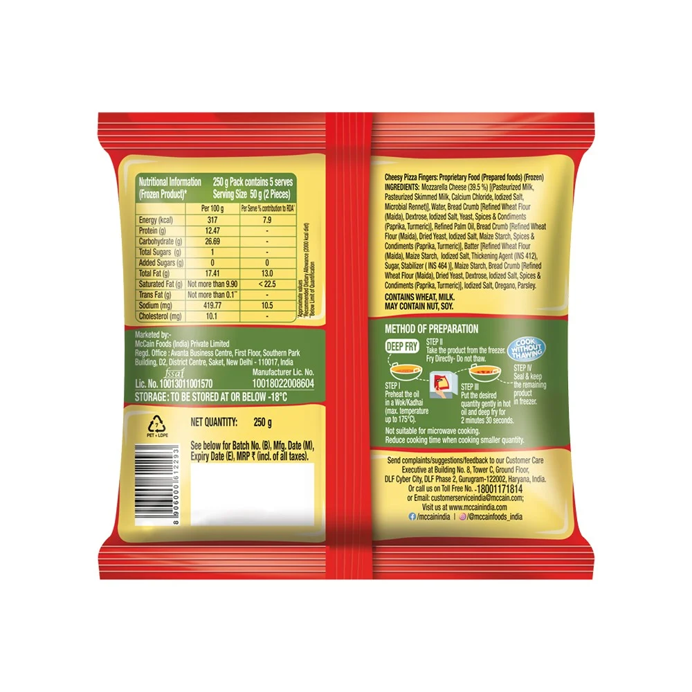 Mozzarella Cheese (39.5 %) [Pasteurized Milk,Pasteurized Skimmed Milk,Calcium Chloride,Iodized Salt,Microbial Rennet),Water,Bread Crumb [Refined Wheat Flour (Maida),Dextrose,lodized Salt,Yeast,Spices & Condiments (Paprilka,Turmeric)] Refined Palm Oil,Bread Crumb Refined Wheat Flour (Maida),Dried Yeast,lodized Salt,Maize Starch,Spices & Condiments Paprika,Turmeric)).
