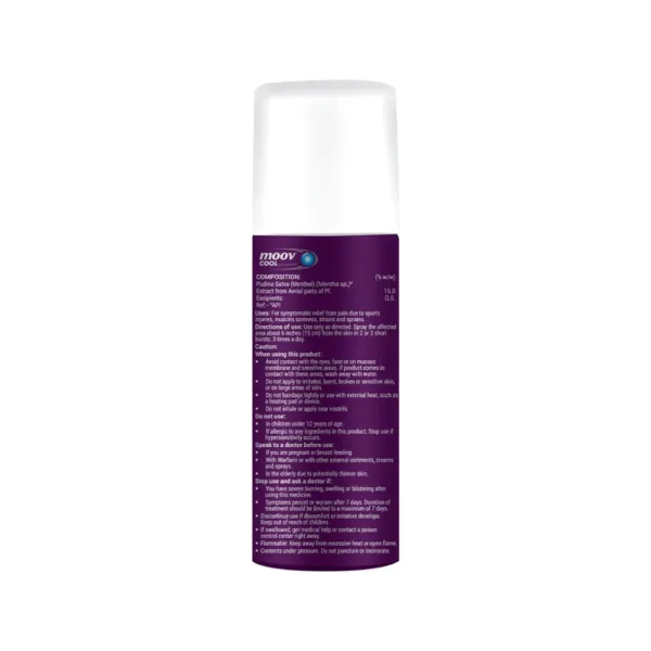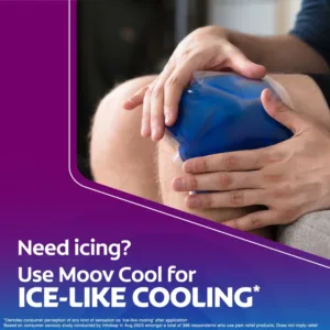 Moov Cool is a revolutionary new Cold Therapy spray for body pain relief. Sports injuries, sprains, and strains often need cooling/icing to heal. Moov Cool provides ice-like cooling sensation without any ice! Simply apply Moov Cool 3-4 times a day on the affected area to cool the pain. Moov Cool is made from natural ingredients and safe to use.