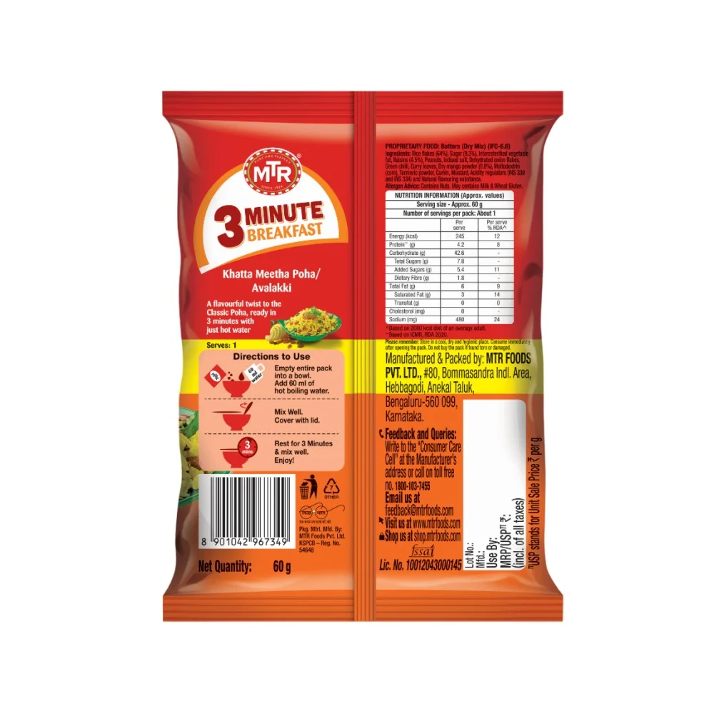 MTR Khatta Meetha Poha is a fulfilling meal for breakfast which becomes ready to be served in just a few minutes. This Poha mix consists of beaten rice mixed with peanuts and a dash of lemon juice and has a delectable nutty, sweet and sour flavour.