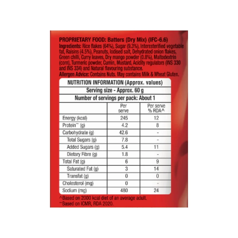 Rice Flakes (64%),Sugar,Edible Vegetable fat interesterified (Made with Palm Oil and Palm Kernel Oil),Raisins,Peanuts,Salt,Dehydrated onion,Green chili,Curry leaves,Turmeric,Dry Mango Powder,Mustard,Cumin,Maltodextrin,and Acidity regulator Citric Acid (INS 330) and Tartaric Acid (INS 334).