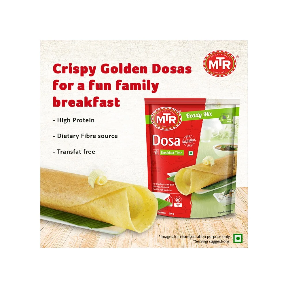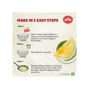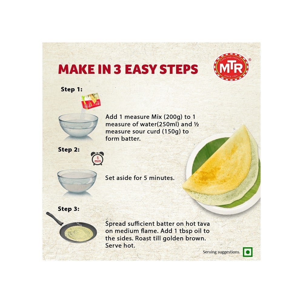 MTR Breakfast Mix Dosa is an instant mix for preparing batter of dosa. The mixture contains well measured proportion of all the ingredients using which it is easy to make delicious, crispy dosa.