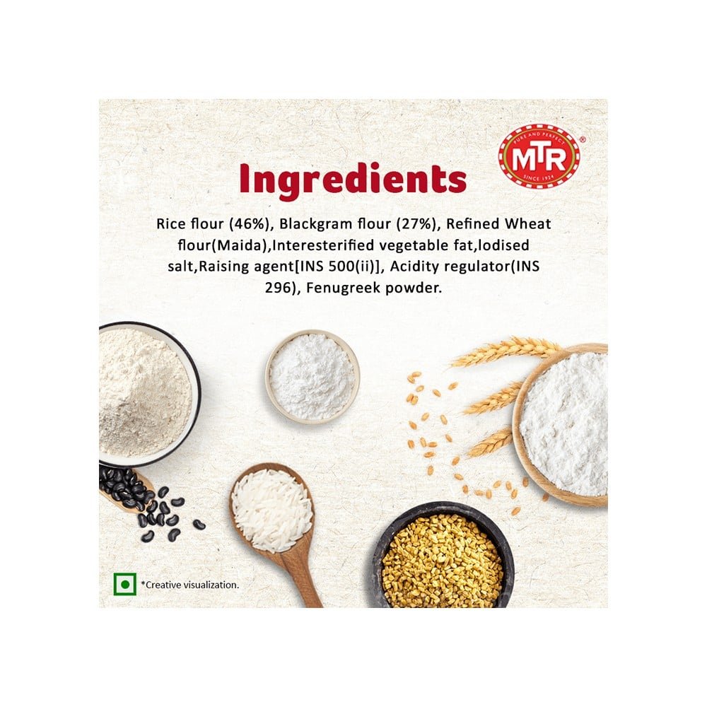Rice flour (46%),Black gram Dal (27%),Refined Wheat Flour,Edible Vegetable fat-interesterified (Made from any or all of the following permitted Vegetable Oils: Palmolein Oil,Rice Bran Oil,Soyabean Oil,Maize (Corn) Oil,Sesame Oil,Groundnut Oil),Salt,Leavening agent: Sodium bicarbonate,Acidity Regulator: Malic Acid,Fenugreek.