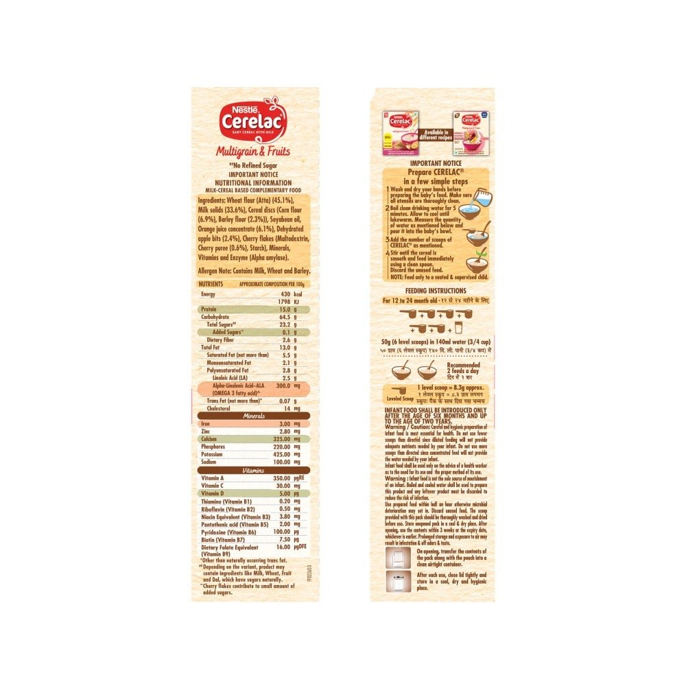 Nestlé Cerelac Baby Cereal With Milk Is A Complementary Baby Food For Infants From 12 To 24 Months. This Baby Cereal Is Packed With The Goodness Of Cereal, Milk, And Fruit. With 155 Years Of Scientific Expertise In Infant Nutrition, Nestlé Develops Infant Nutrition Products Backed By Evolving Science And Research. Contains No Refined Sugar. Important Notice: Mother’s Milk Is Best For Your Baby.