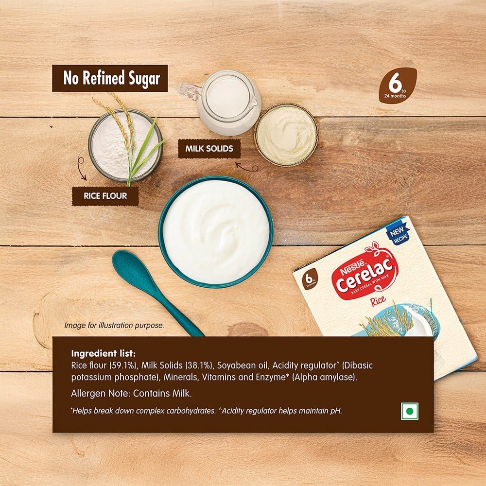 Rice flour (59.1%), Milk Solids (38.1%), Soyabean oil, Acidity regulator (Dibasic potassium phosphate), Minerals, Vitamins and Enzyme (Alpha Amylase).Allergen Note:Contains Milk.