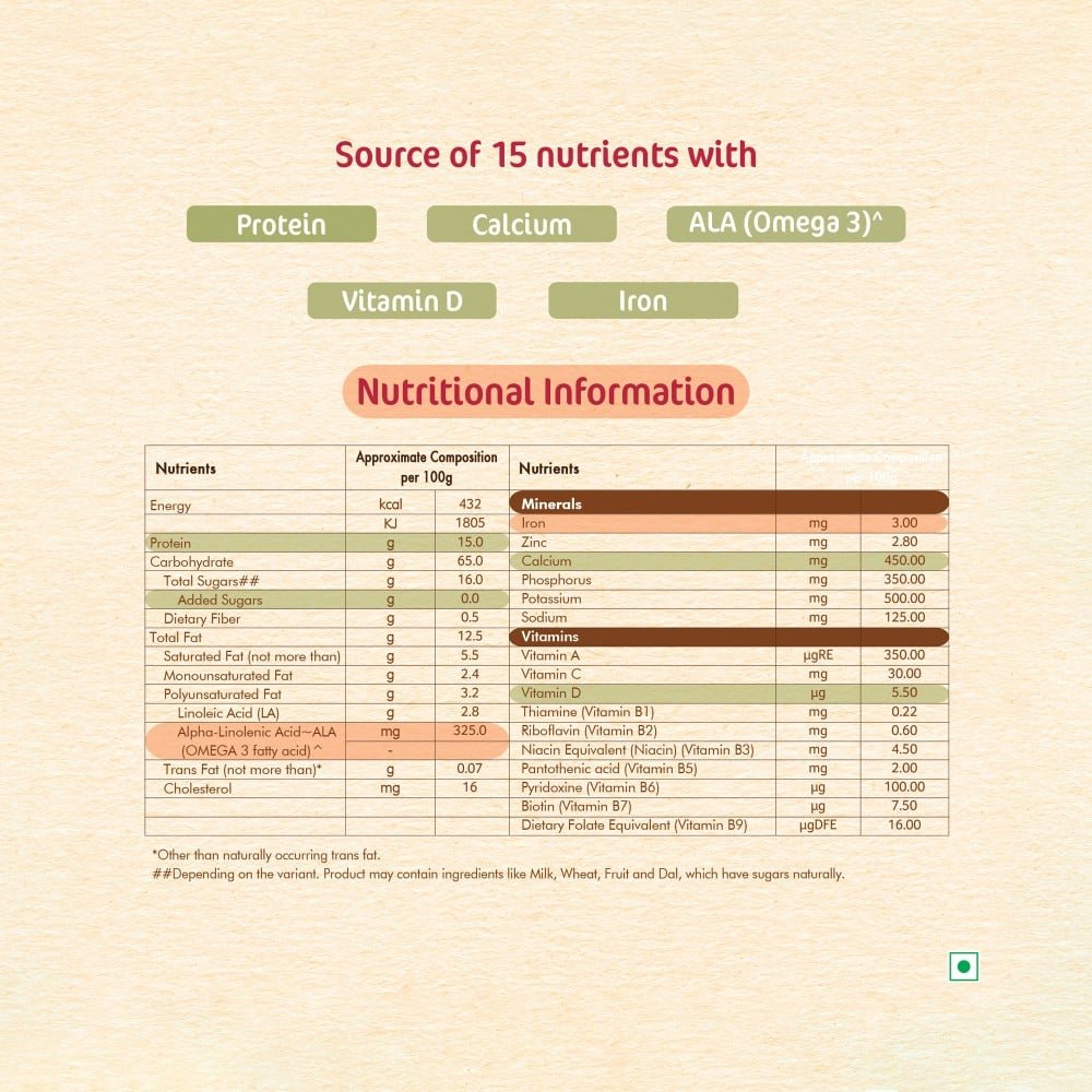With 15 Nutrients : Protein, Calcium, Ala (Omega 3) & Vitamin D.
