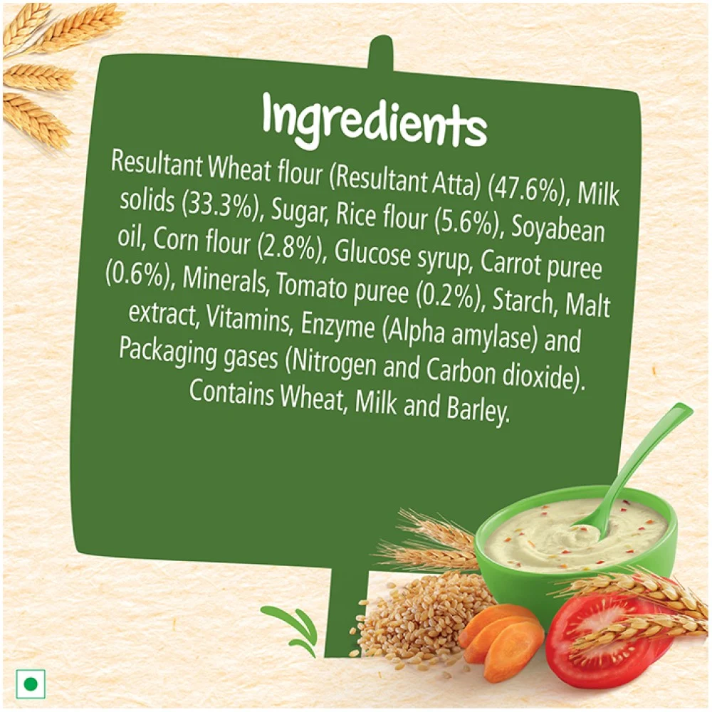 Resultant Wheat flour (Resultant Atta) (47.6%), Milk solids (33.3%), Sugar, Rice flour (5.6%), Soyabean oil, Corn flour (2.8%), Glucose syrup, Carrot puree (0.6%), Minerals, Tomato puree (0.2%), Starch, Malt extract, Vitamins, Enzyme (Alpha amylase) and Packaging gases (Nitrogen and Carbon dioxide).