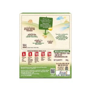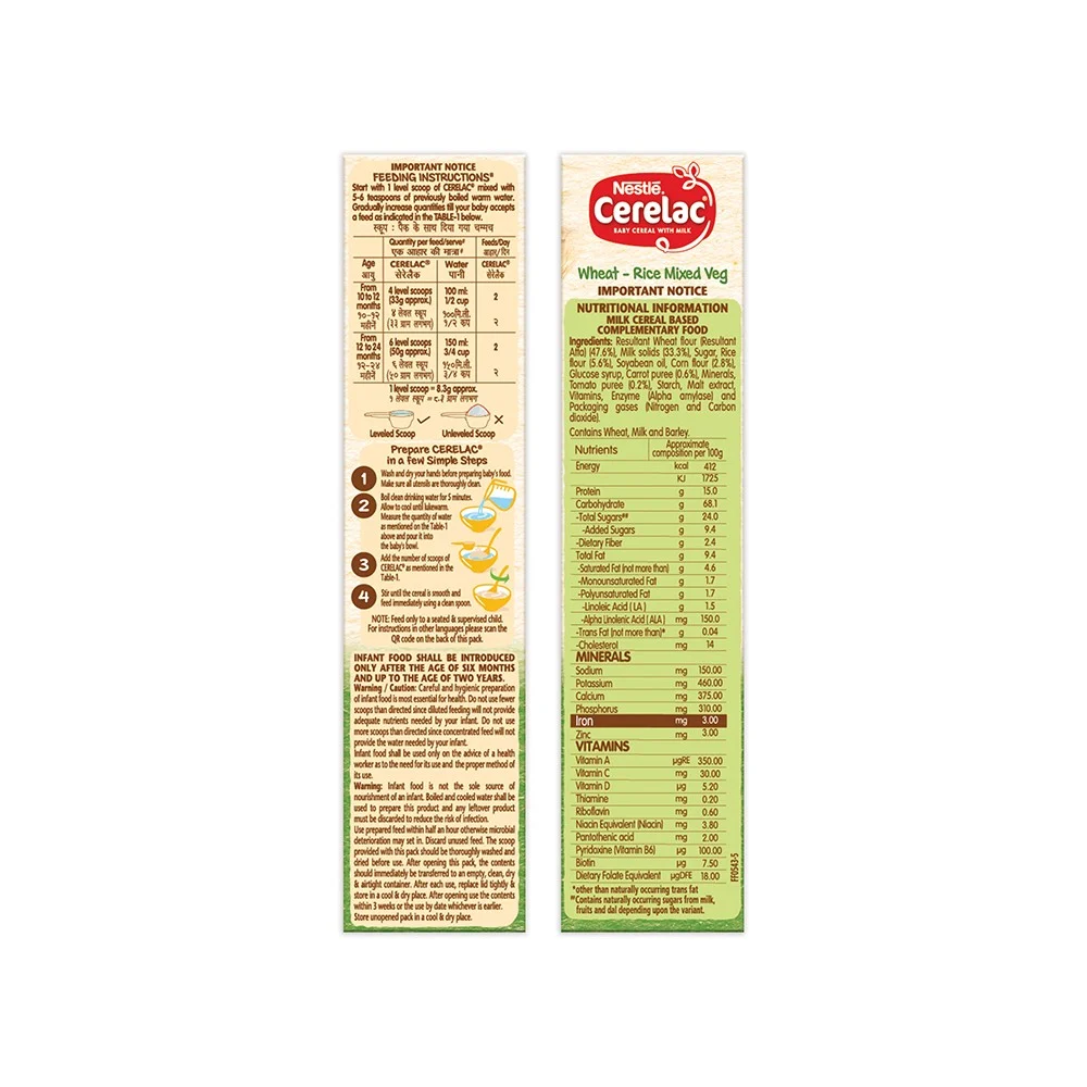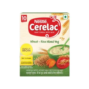 Nestle CERELAC Baby Cereal with Milk, Wheat – Rice Mixed Veg is a complementary food for babies from 10 to 24 months. While infants and children have higher requirements of nutrients than adults, 2 serves of CERELAC Wheat – Rice Mixed Veg Cereal provides 37% of a baby‚ daily need of iron. It is also a source of 14 important nutrients including vitamins and minerals.