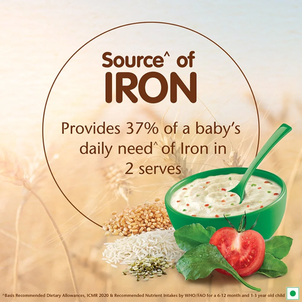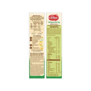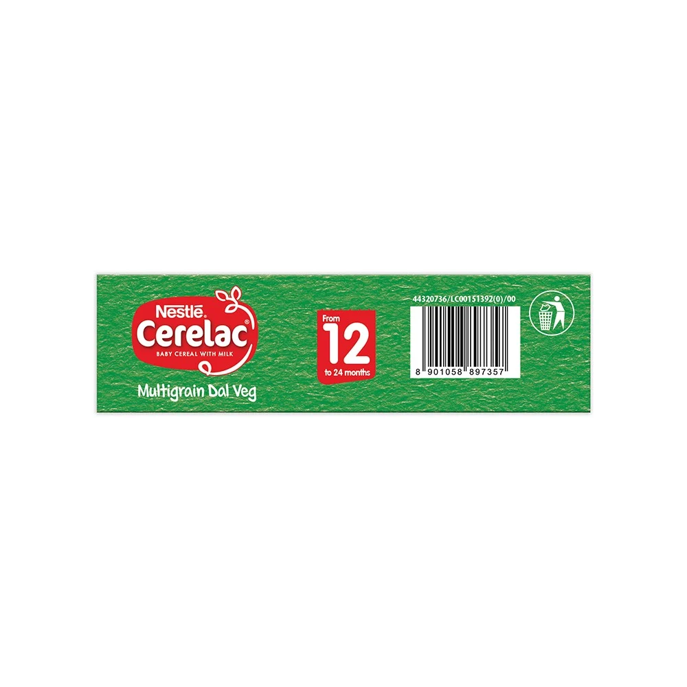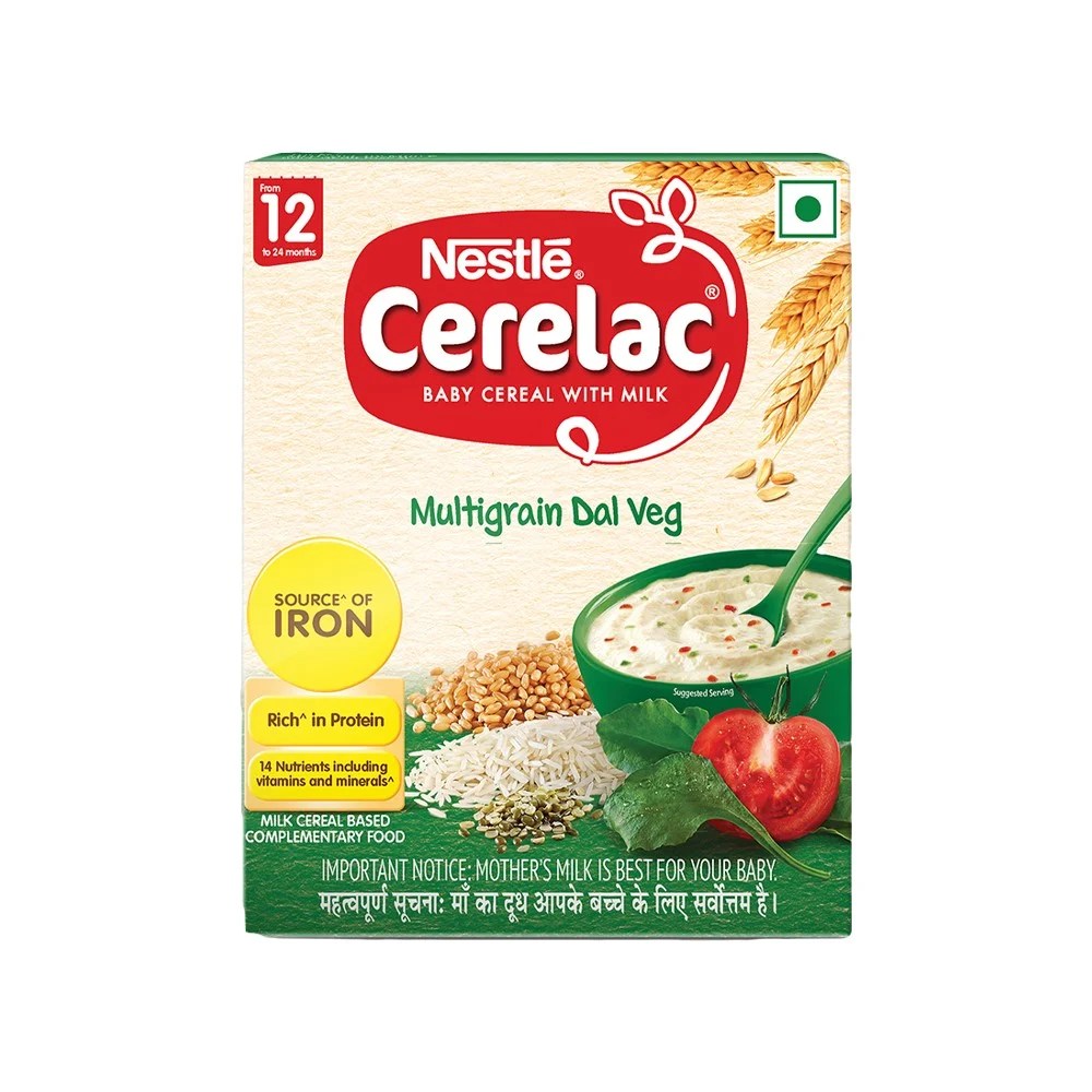 Nestle CERELAC Baby Cereal with Milk, Multigrain Dal Veg is a complementary food for babies from 12 to 24 months. While infants and children have higher requirements of nutrients than adults, 2 serves of CERELAC Wheat Multigrain Dal Veg Cereal provides 37% of a baby‚ daily need of iron. It is also a source of 14 important nutrients including vitamins and minerals.