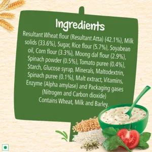 Resultant Wheat flour (Resultant Atta) (42.1%), Milk solids (33.6%), Sugar, Rice flour (5.7%), Soyabean oil, Corn flour (3.3%), Moong dal flour (2.9%), Spinach powder (0.5%), Tomato puree (0.4%), Starch, Glucose syrup, Minerals, Maltodextrin, Spinach puree (0.1%), Malt extract, Vitamins, Enzyme (Alpha amylase) and Packaging gases (Nitrogen and Carbon dioxide)