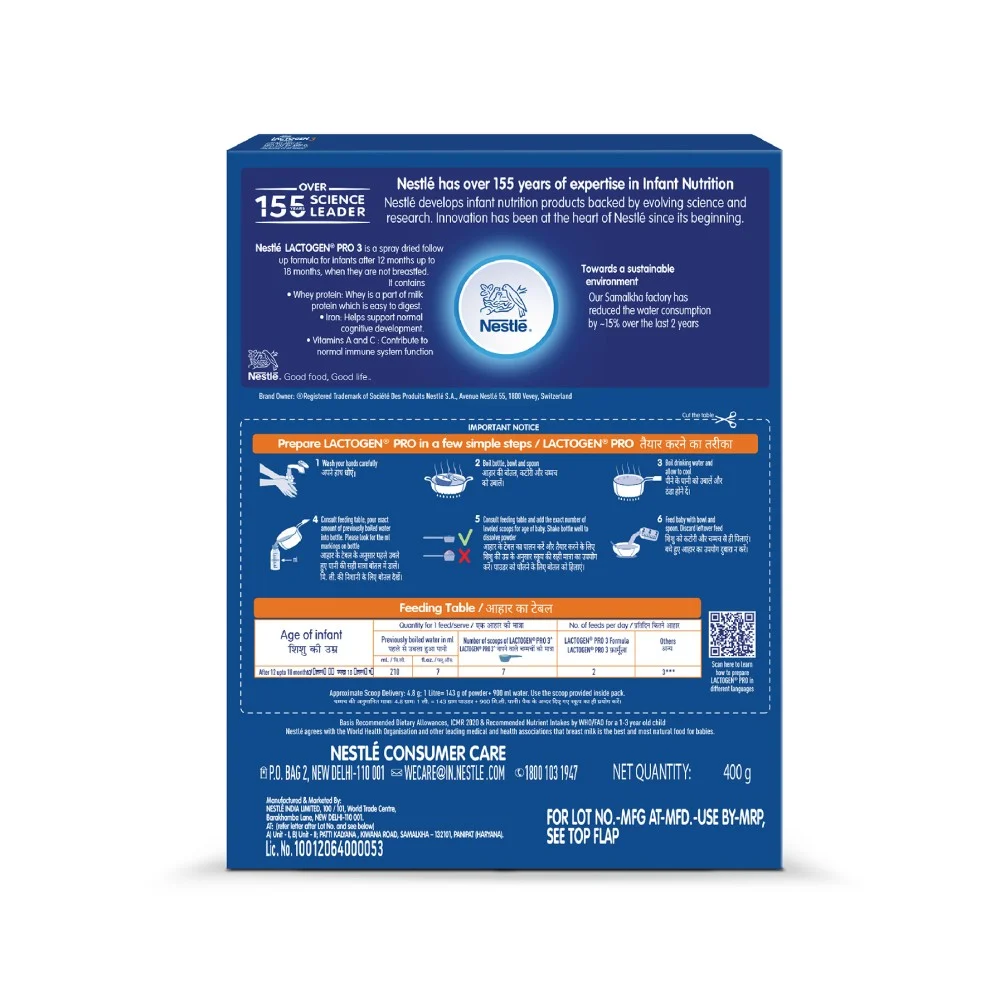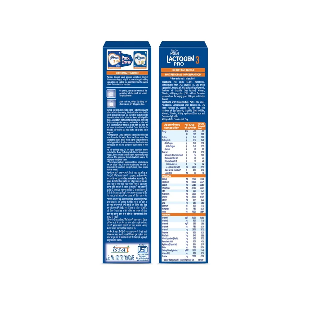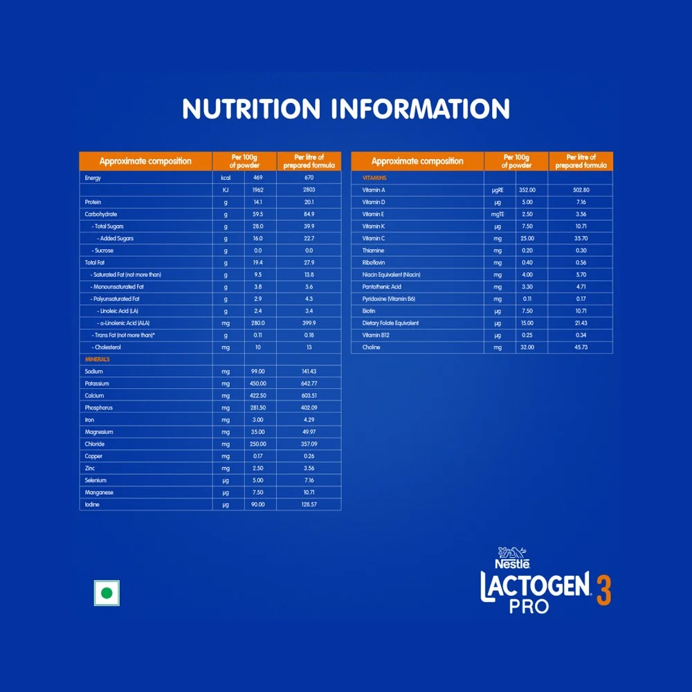 Nestlé Lactogen Pro 3 baby milk powder is a spray-dried follow-up formula for infants after 12 months up to 18 months when they are not breastfed. It contains Iron that helps support normal cognitive development. It also has vitamins such as Vitamins A, C & D and whey protein for normal immune system functioning.Nestlé brings its expertise in infant nutrition backed by science and research.