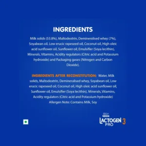 INGREDIENTS AFTER RECONSTITUTION: Water, Milk solids, Maltodextrin, Demineralised whey, Soyabean oil, Low erucic rapeseed oil, Coconut oil, High oleic acid sunflower oil, Sunflower oil, Emulsifier (Soya lecithin), Minerals, Vitamins, Acidity regulators (Citric acid and Potassium hydroxide) Allergen Note: Contains Milk, Soy