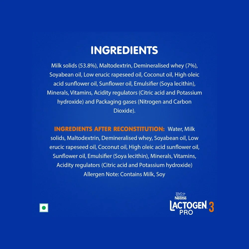 Milk solids (53.8%), Maltodextrin, Demineralised whey (7%), Soyabean oil, Low erucic rapeseed oil, Coconut oil, High oleic acid sunflower oil, Sunflower oil, Emulsifier (Soya lecithin), Minerals, Vitamins, Acidity regulators (Citric acid and Potassium hydroxide) and Packaging gases (Nitrogen and Carbon Dioxide).