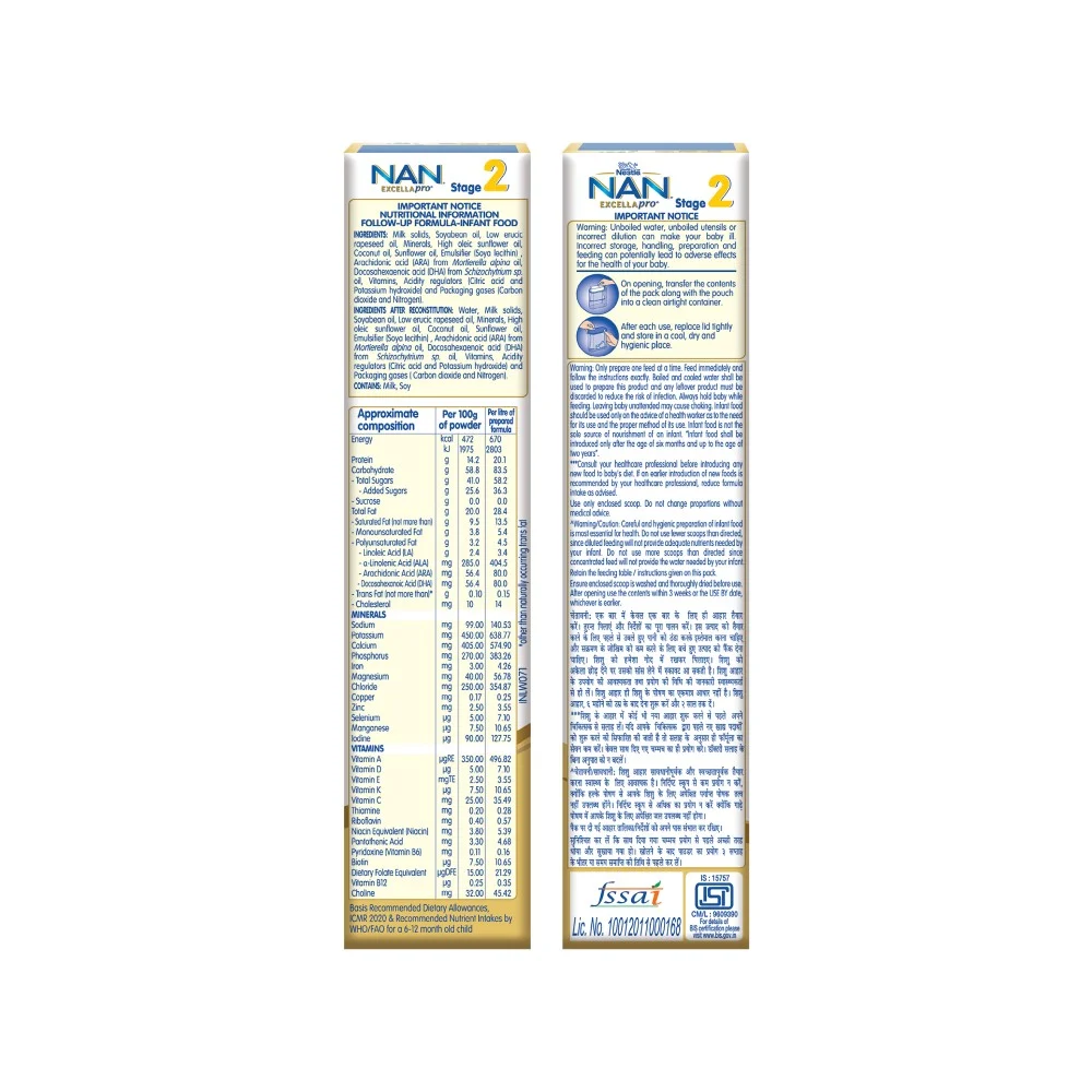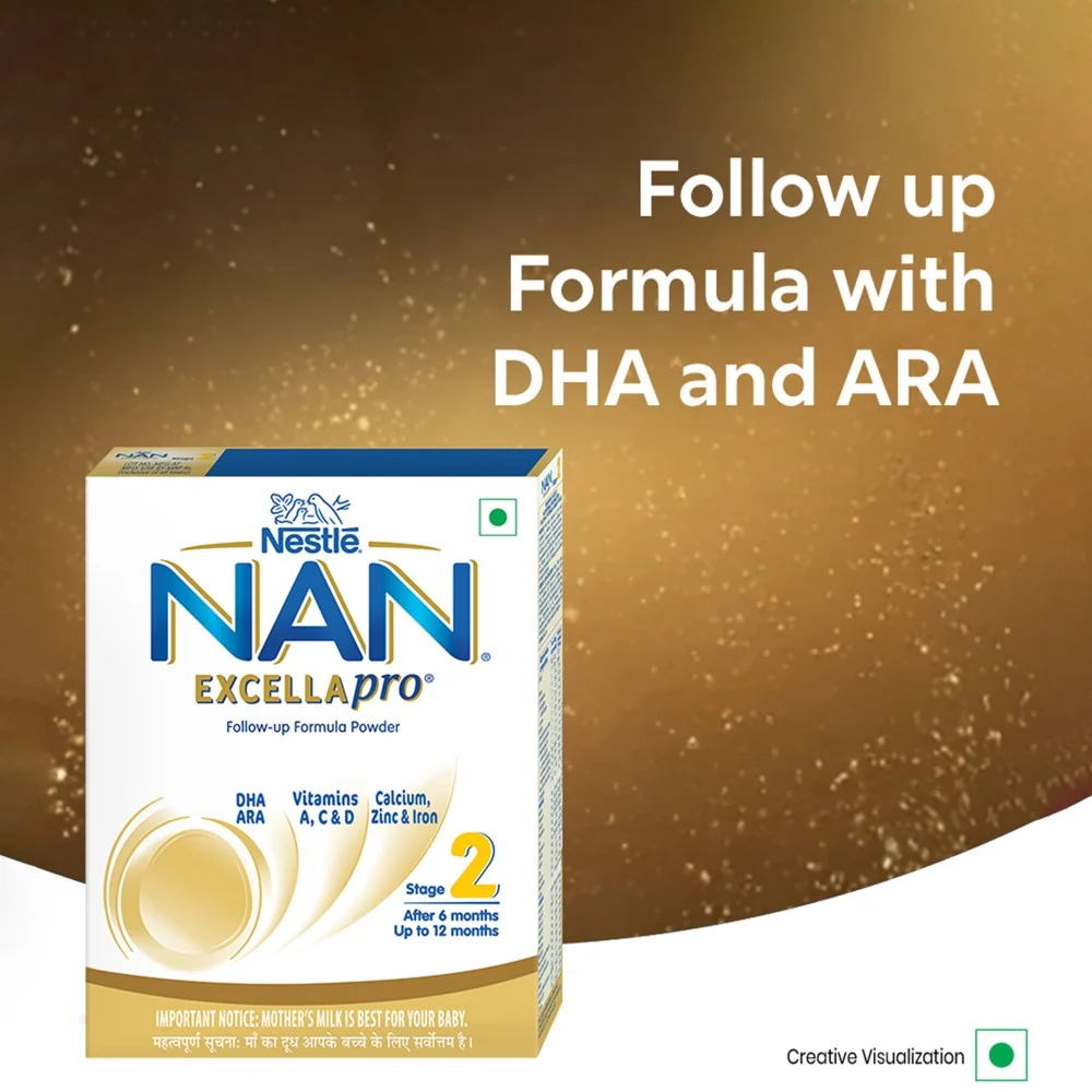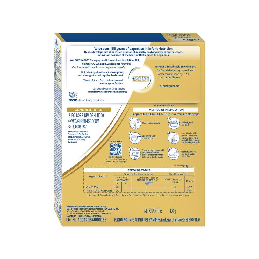 Nestlé NAN EXCELLAPRO 2 is a spray dried follow-up formula with DHA, ARA, Vitamins and Minerals for babies after 6 months. It contains DHA for normal brain development & Iron for normal cognitive development. With Vitamin A, C, & Zinc for normal immune system function and Calcium & Vitamin D to support bone growth and development.