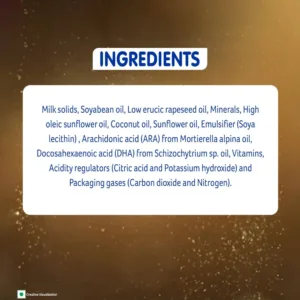 Milk solids, Soyabean oil, Low erucic rapeseed oil, Minerals, High oleic sunflower oil, Coconut oil, Sunflower oil, Emulsifier (Soya lecithin), Arachidonic acid (ARA) from Mortierella alpina oil, Docosahexaenoic acid (DHA) from Schizochytrium sp. oil, Vitamins, Acidity regulators (Citric acid and Potassium hydroxide) and Packaging gases (Carbon dioxide and Nitrogen).