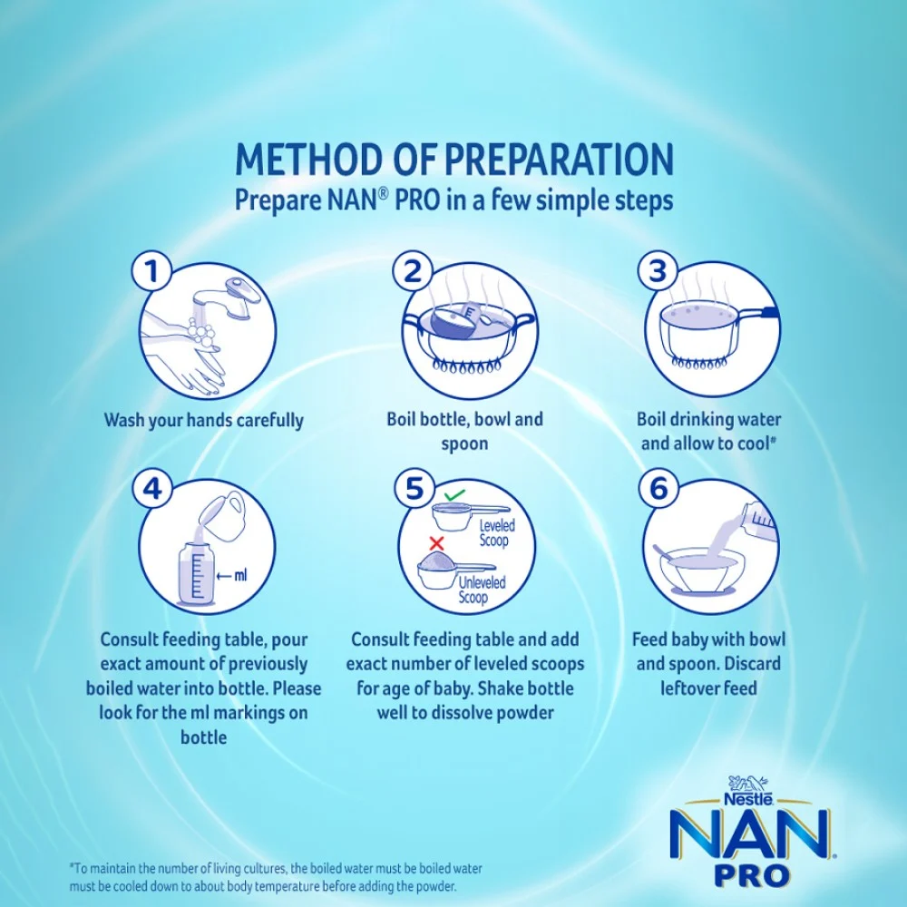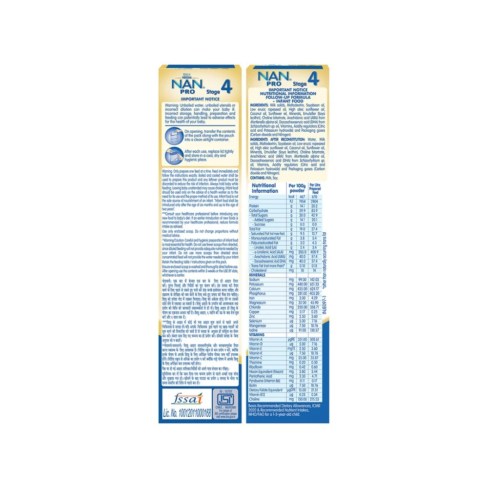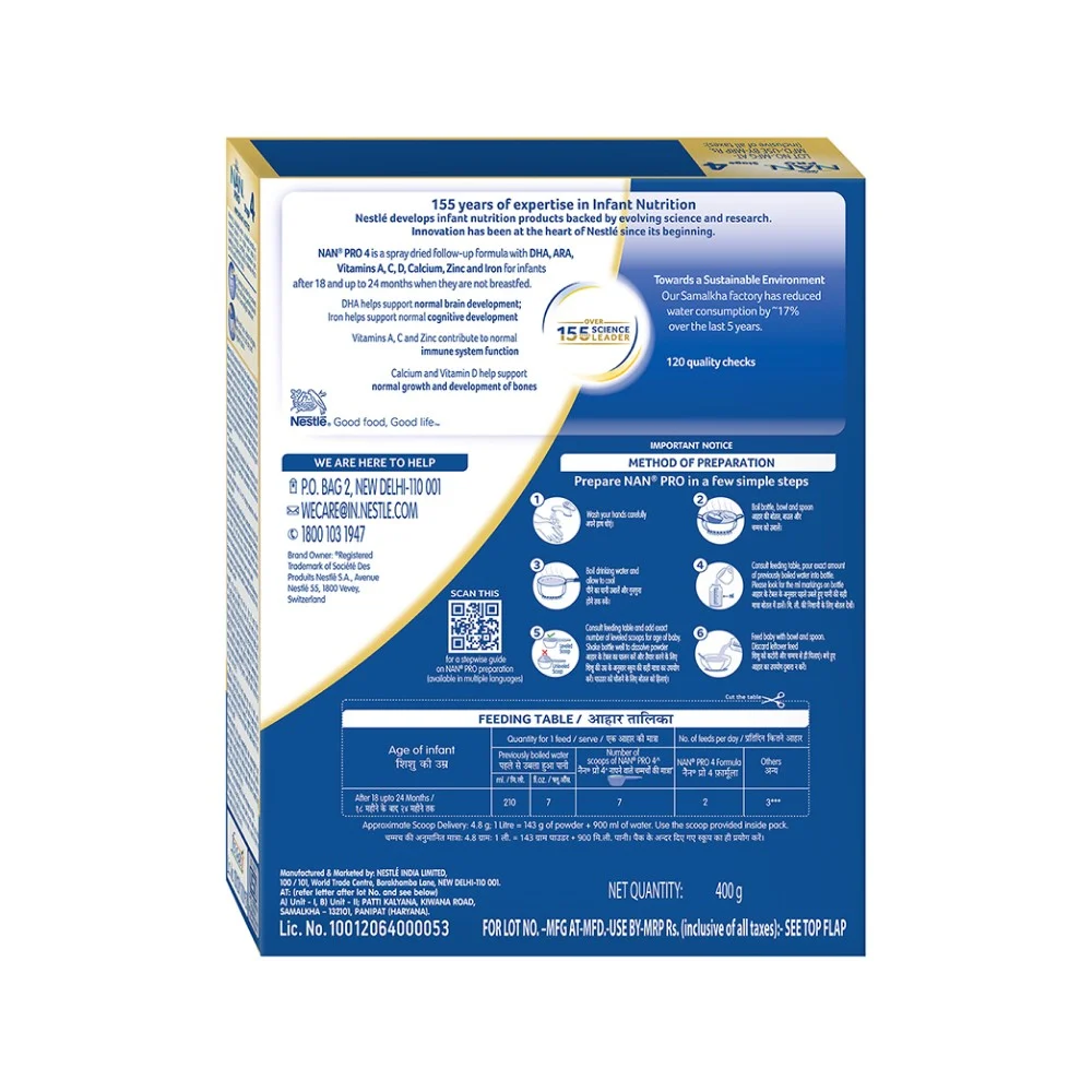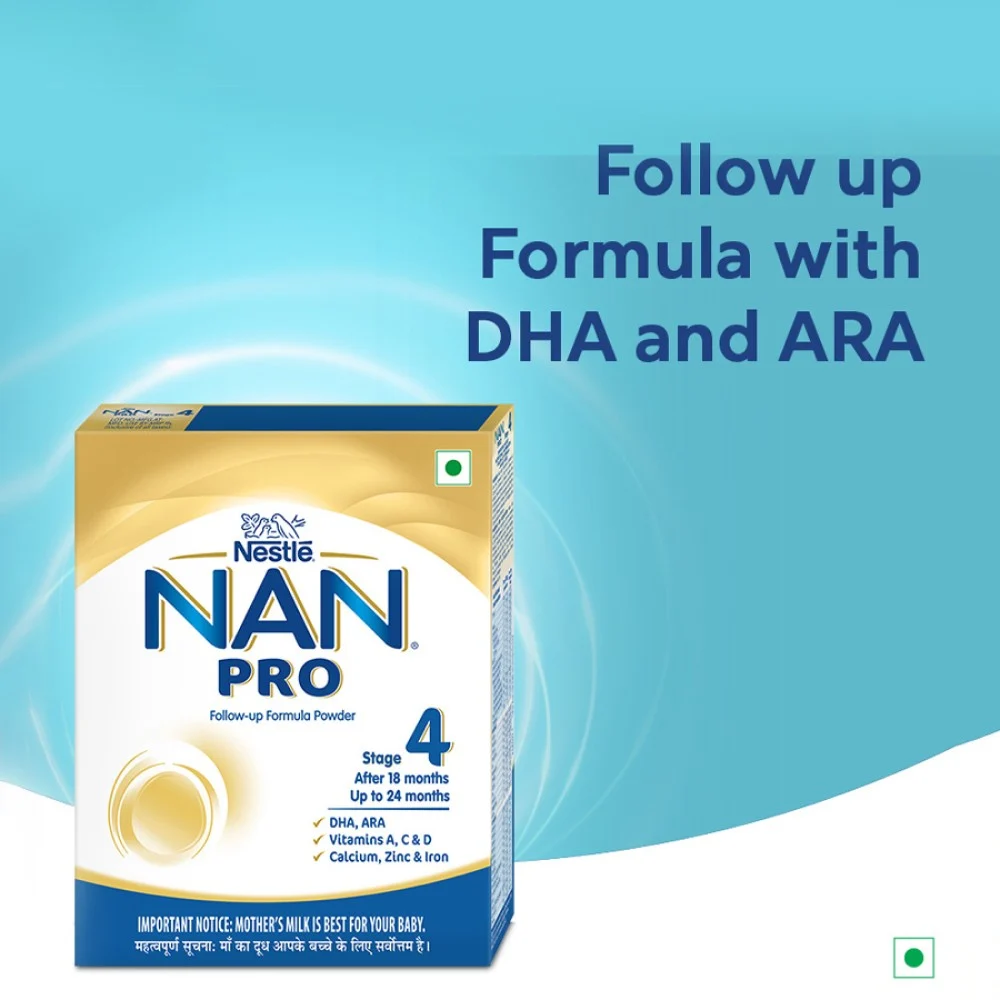 Nestlé NAN PRO 4 is a spray dried follow-up formula with DHA, ARA, Vitamins & Minerals for babies after 12 months. DHA helps support normal brain development, Iron helps support normal cognitive development & immune system. Vitamin A, C, & Zinc supports a normal immune system function and Calcium & Vitamin D supports bone growth and development. Mother’s milk is best for your baby.