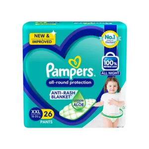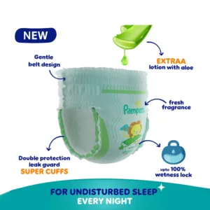 NEW IMPROVED Pampers all round protection pants have ANTI RASH BLANKET* containing Lotion with Aloe Vera, to keep your baby’s skin protected from rashes, with Up to 100% WETNESS LOCK. It keeps the pee locked inside and baby’s bum stays dry all night. Pampers unique Magic gel technology provides up to 12 hours of dryness and has up to 2X faster absorption (*Blanket refers to soft topsheet)