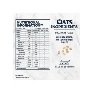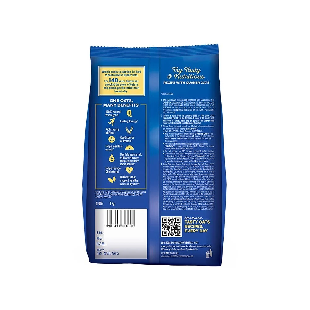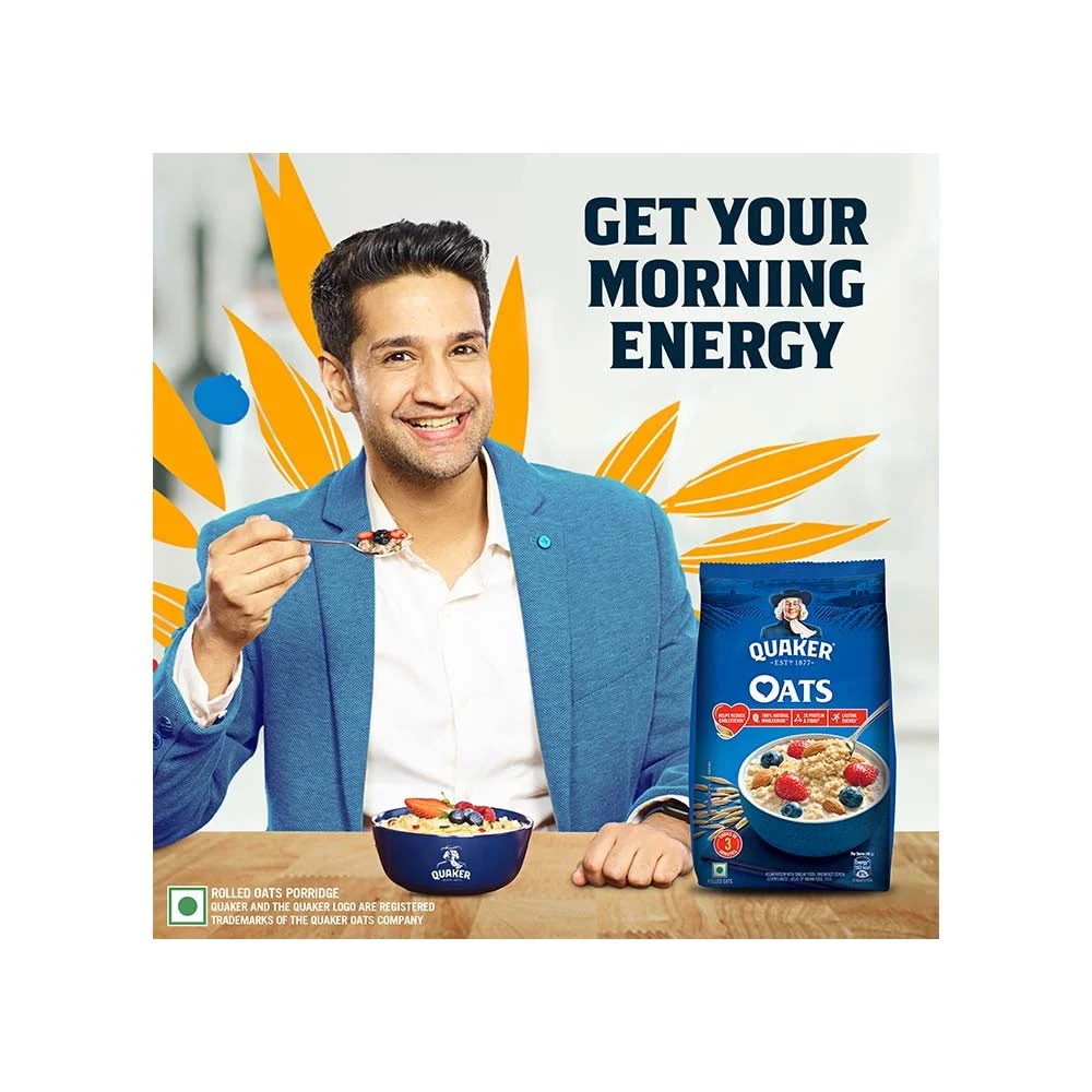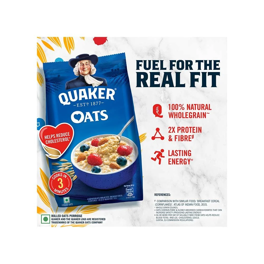 Lasting Energy : Start the day with a bowlful of nutritious & tasty Quaker Oats. These 100% Natural Wholegrain Oats have complex carbohydrates that breaks down slowly to provide energy that lasts.