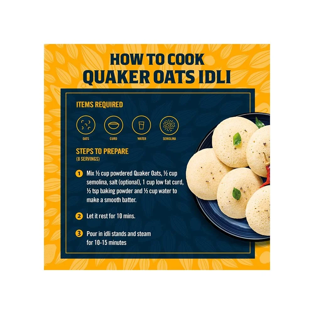 Easy to Cook : Ready in just 3 minutes. Quaker Oats can be eaten sweet or savoury or add them as a wholesome ingredient in your favorite dishes, such as Idli or Poha or Masala Oats or whip some classic oatmeal cookies. Enjoy the wholesome benefits of this whole grain in any number of meals or snacks, any time of day.