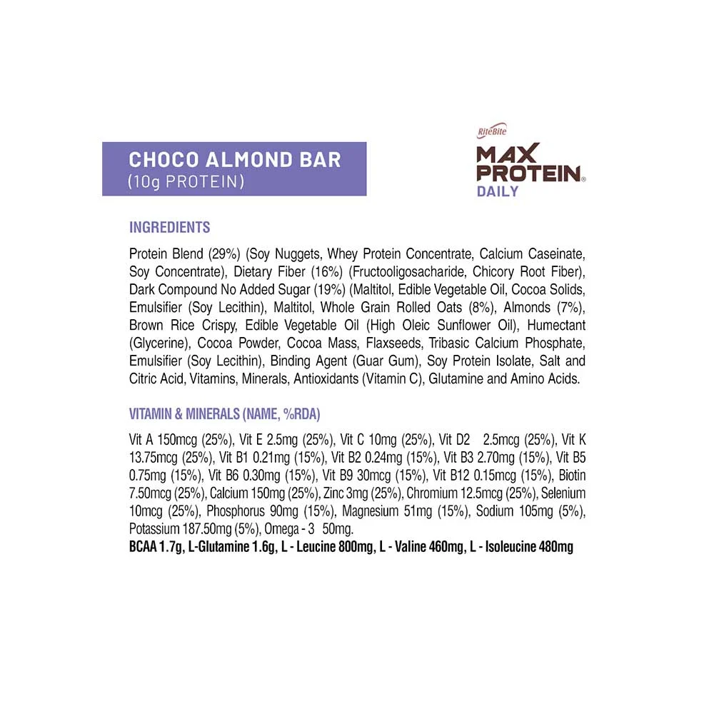 Protein Blend, Fiber, Vitamins & Minerals, No Preservatives, 100% Veg, No Added Sugar, For Energy, Fitness & Immunity. Bar for everyone: With 10gms of protein in each bar and 5gms of fiber and goodness of almond in every bite. Max Protein Choco Almond Bar is the perfect bar for your daily lifestyle with no preservatives and no artificial sweeteners with a balance of taste and health and 100% vegetarian